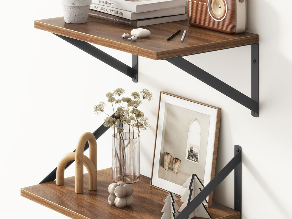 【FARMHOUSE RUSTIC WALL SHELF】These floating shelves are made of premium engineered wood board and visible triangular bracket. The rustic wooden grain surface add character and warmth to any modern or traditional interior with these deep floating shelves, contrast shelves at staggering heights on the wall or mount side-by-side or in the corner for a clean streamlined look. 【12 INCH DEEP FLOATING SHELF】This extra deeper and wider wall shelves are 12 inches in depth and 16 inches in length instead of the regular narrow floating shelves, you can put photos, pictures, DVD players, videos, books, toys, and some other knickknack on this beautiful display wooden shelf. 【Free Up Space In Your Home】The Shelves for wall storage Gives the illusion of a larger space in your studio apartment, dorm room, home & kitchen, or small living quarter - Easily modify your floating wood shelf to fit your needs and Display succulent plants, collectibles, Trophies, Photos, Frames, book shelves. 【DECORATIVE & FUNCTIONAL】The wall-mounted floating shelves are designed for decoration and storage, utilizing and decorating any space in your home. Used as shelf decor to show your collection, books, or prize, the hanging shelves are perfect for displaying your photo frame, small plants, model, or audio in your living room, office, study. And can also use as over the toilet storage shelf in the bathroom to hold toiletries or used as kitchen shelf to storage condiments. 【Easy to Assemble】These shelves come with all mounting hardware and instructions. You can install them in less than 15 minutes. If you have any questions about our products, please feel free to contact us and we will try our best to solve them for you!