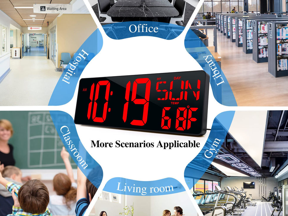 1. Bluetooth Automatic Time Sync : 17.2'' large digital wall clock with Bluetooth 5.3 technology, not need manual time-setting, digital calendar can one key to sync phone time, automatic calibration time 4 times per day, enjoy convenience and precision 2. Multiple Functions and Convenient to Use: This LED wall clock can press mode button or use the Remote Control to operate, operated from up to 32 ft, have 9.5ft long power cord; very suitable for Gym Home Garage Office Classroom and limited mobility 3. Count Up/Down Timer Easy to Hang: Digital clock large display max timing period for 29 hour 59 min 59 sec, good timer for fitness, exams, cooking, competition; No need to drill holes, double sided tape allows hanging board firmly attached to the wall 4. Outlet Powered with Memory Battery: Our large wall clock is outlet powered, memory battery only use for saves the system settings and keeps the time running when outlet power failure, clock can works without memory battery. 5. Reassured After Sales Service: If this digital wall clock breaks or damaged in shipping, or any problems you encounter in using, please feel free to contact us(how to: click on your order--contact seller), we will solve them in 24 hours