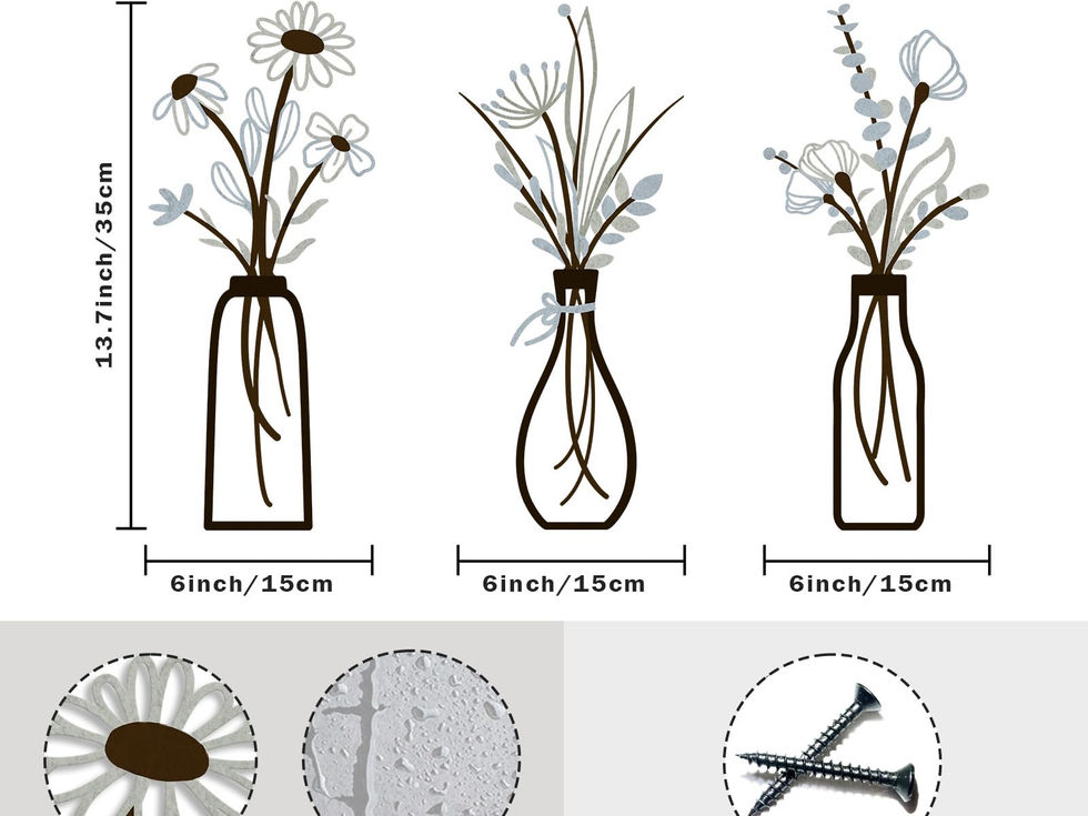 Premium Quality: Crafted with care, these 6x13.7 inch metal wall art pieces are made to impress. Natural Themed Design: Beautifully designed with minimalist black flower silhouettes, these wall decors bring a touch of nature to your home. Versatile Placement: Perfect for your home, bedroom, dining room, or any living space, these wall arts effortlessly enhance any room's ambiance. Trendy Boho Style: Embrace the modern boho trend with these chic metal vase flowers wall art that adds a unique artistic flair to your decor.Surprise your loved ones with this thoughtful and stylish wall art set, perfect for housewarming or special occasions. Easy Installation: Package comes with pre-drilled , making it a breeze to hang and transform your space.