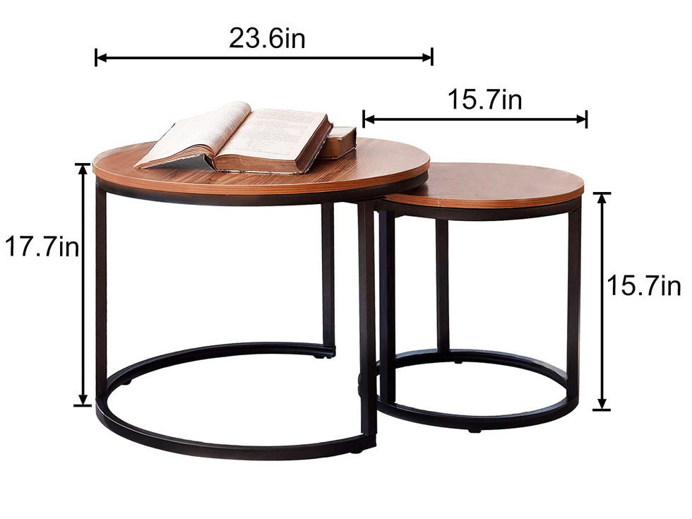 【COMBIME AS YOU LIKE】 Nesting coffee tables include a large table (Φ 23.6 × 17.7 inch) and a small table (Φ 15.7 × 15.7 inch). A small table can be placed under the bigger one. You can combine them as you like. 【STRONG & DURABLE】 Made in denser and uniform particle board, the walnut patterned desktop has a retro and elegant appearance. The thickness is 0.59inch with 99lbs capacity . The surface is scratch-resistant and waterproof, which is very strong and durable. 【UNIQUE & DESIGNED】 The round tabletop and semi-circular steel leg have beautiful lines. The elegant and industrial style bring a unique experience to your living space. giving your visitors a good impression 【SIMPLE ASSEMBLY & EASY MAINTENANCE】 It's easy to assemble with the installation instructions and accessories in the package, you can make it in few minutes. 【DETAIL-ORIENTED】If there are product defects during transportation and product color difference under different lights, please contact us in time and we will give you a satisfactory solution.