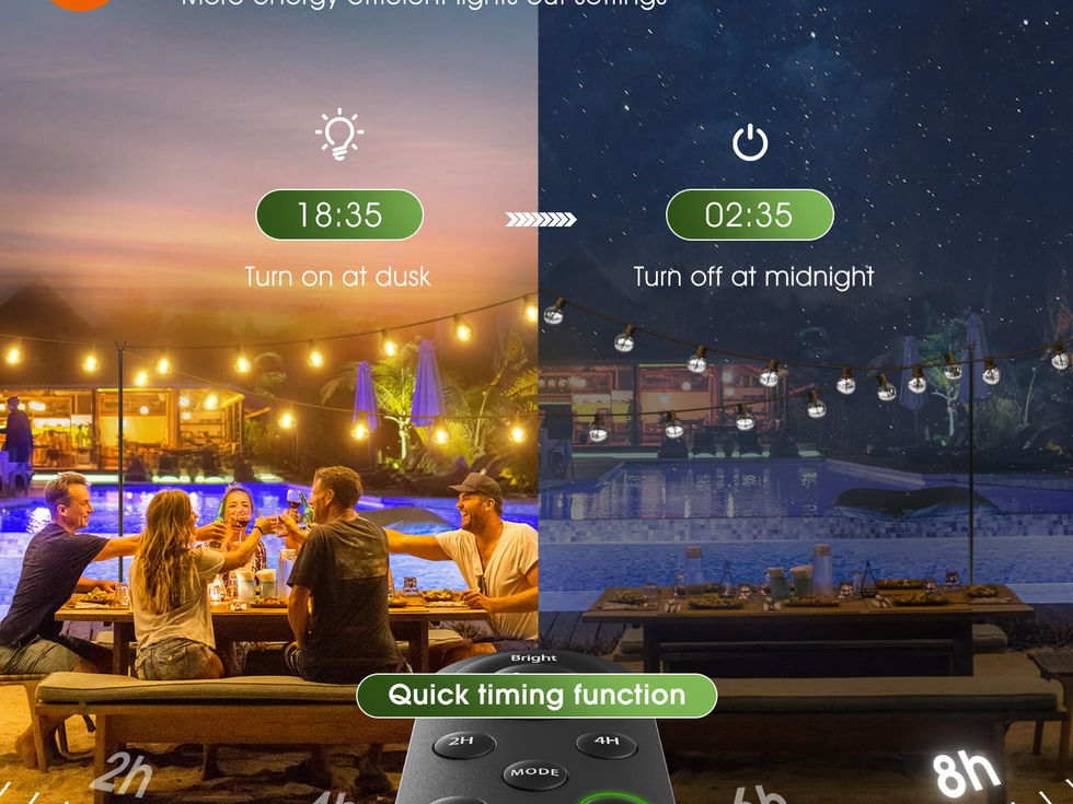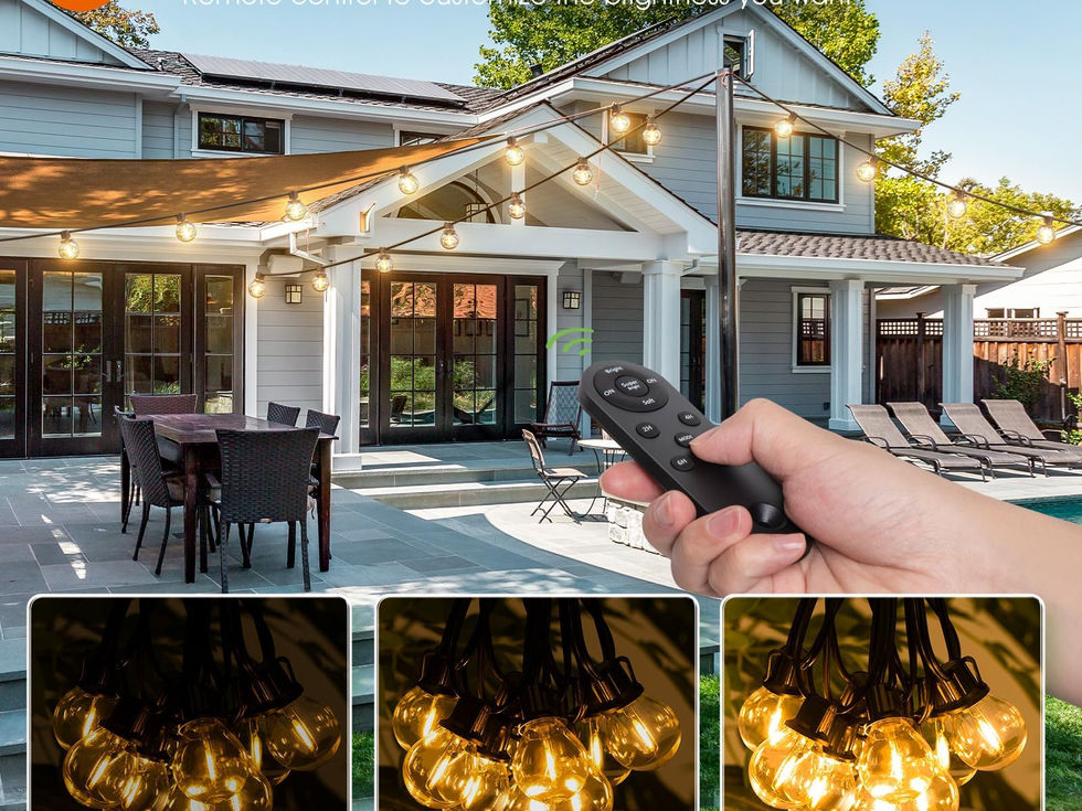 Upgraded Remote: Your Ambiance, Your Way : Adjust brightness to 3 levels (Soft, Bright, Super Bright), switch between 3 light modes(Breathing/Flashing/Constant), and set timers for 2, 4, 6, or 8 hours—all without needing extra timers or dimmers. Whether creating a cozy nook or energizing a party, this remote puts complete control at your fingertips. 100FT Solar String Lights plus 6FT extension : Brighten your space with solar string lights for outside, featuring 54 LED G40 bulbs (4 spares) and a detachable solar panel with an on/off switch. With 2-foot spacing between bulbs and a 6-foot lead from the panel to the first bulb, you get 100 feet of vibrant illumination. Install anywhere you like—No Power Outlets Needed! Dual Charging Options: Solar Powered & USB : Rely on the high-efficiency solar panel for up to 20 hours of light after 8 hours of charging in the sun, or use the USB port to recharge in just 4 hours. This versatile charging ensures your space stays lit, rain or shine, providing reliable lighting anytime you need it. Automatic Day-Night Operation : The solar panels with our built-in light sensors. These smart sensors automatically turn the lights on at dusk and off at dawn, so you never have to worry about remembering to switch them. Enjoy a beautiful glow that seamlessly transitions from day to night, enhancing your outdoor lighting with zero effort. Robust and Weather-Resistant Design : Rain or shine, our solar lights outdoor waterproof stand strong. Featuring shatterproof bulbs and an IP65 waterproof rating, these outdoor lights withstand wind, rain, and snow, making them suitable for any season. Let your outdoor decor shine, no matter the weather!