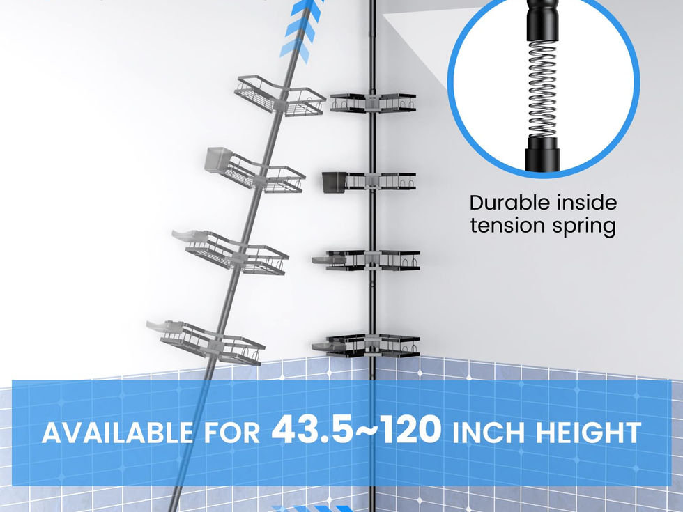 EASY INSTALLATION AND REMOVAL - We have attached a very detailed instruction manual and uploaded an installation tutorial video of shower caddy, which can be viewed by scanning the code to help you assemble quickly and efficiently. No drilling and hardware are required, and there will be no damage to the ceiling and walls. Even if you want to move or make adjustments, it is easy. (Note: This tension rod shower caddy is not suitable for sloping ceilings and very thin suspended ceilings.) WON'T SHAKE OR SLIDE - When installing, you can adjust the four shelves to the height that suits you. During use, due to the buckle design, the friction area is increased, and even the pressing of the pump shampoo will not cause the shelf to slide off. The strong tension spring inside the tension pole makes it in close contact with the ceiling and floor, and it will not shake or fall. Two transparent buckles can also fix the position of the tension pole well. 43.5-120 IN ADJUSTABLE HEIGHT FOR ALL BATHROOMS - This corner shower caddy tension pole fits any space from 50 to 96 inches, you can adjust it according to the actual height of your bathroom toilet restroom washroom. And it also suitable for the kitchen, RV, laundry room etc. Put this standing shower caddy in the corner, it won't take up much of your space, which is designed to provide you with practical and beautiful storage methods to make your space neat and orderly. STAINLESS STEEL MAKES UP THE ENTIRE SHOWER CADDY - The tension pole and shower rack are all made up of stainless steel. It will not rust, is not easily deformed, not easily broken, and has a strong load-bearing capacity, making it very suitable for wet environments such as bathrooms. And with our shelves' hollow grid design, you can easily keep your bathroom and toilet clean and fresh by quickly draining the moisture from the toiletries and shower organizer to keep them dry. MEET ALL YOUR SHOWER STORAGE NEEDS - The bathroom organizer with 4 tier large capacity shower shelves, each shelf can storage 2 large pump bottles or 4 medium bottles. Including 16 hooks on the side, 2 soap dishes and a razor holder, it maximizes the use of space in your bathroom, inside shower stall or bath tub. You can place shampoo gel, conditioner, body wash, bar soap and other shower toiletry stuff, it can meet almost all your shower storage needs and keep your toiletries organized.