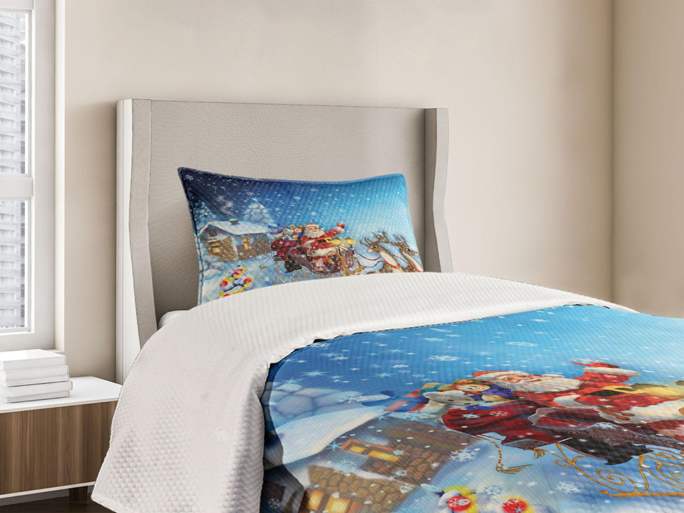 Ambesonne Christmas Bedspread, Santa in Sleigh with Reindeer and Toys