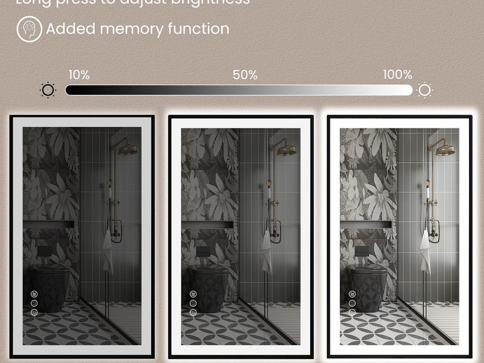[Front Light and Backlit Control Separation]: You can control the front light or back light separately (including the color and brightness), or you can turn them on at the same time; And the matte black aluminum frame wrapped around make the mirror more delicate [3 Colors and Dimmable]: Choose from warm white(6000K), natural light(4000K), or cool white(3000K) with adjustable brightness settings for a customized atmosphere; The smart memory function will record the light settings to next turning on [Anti-fog]: After a few minutes of opening the defogger, the heater in the mirror will disperse the fog from the center to sides, the mirror will still reflect clearly in the bathroom surrounded by hot air; It will turn on with the power on and automatically turns off after 1 hour [Shatterproof & Corrosion Proof]: Our lighted mirror is made of durable tempered glass, highly resistant to breakage and corrosion; It will not shatter into sharp pieces even if broken, will be more safety for home use. [Easy to Install]: With the included two brackets, simply secure them to the wall and hang the mirror horizontally or vertically; You can plug in or hard-wire to wall switch; The mirror surface is covered with a protective plastic film to prevent scratching.