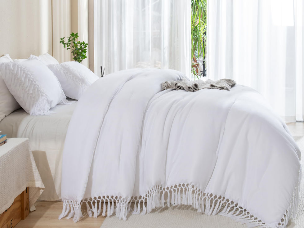 Andency White Comforter Set Queen, 3 Pieces Boho Tassel Lightweight