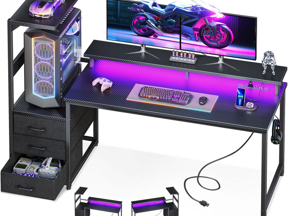 【Gaming Desk with Colorful LED Lights】This gaming desk features LED strip with 10 static colors, 10 dynamic modes and 6 brightness grades to choose from as well as memory function and switching controls. You can easily adjust the lighting to a comfortable level to reduce eye fatigue, improve concentration, and create a comfortable environment. This will greatly enhance your gaming experience and allow you to fully immerse yourself in the game atmosphere. 【USB Charging Ports & Power Outlets】The computer desk is equipped with 3 power outlets and 2 USB charging ports for your electronic devices, you can easily charge up to 5 electronic devices such as smartphones, gaming gear, and Bluetooth devices while working, studying, or playing games. Let this computer desk add more convenience to your life! 【Computer Desk with Powerful Storage Function】Featuring 3 fabric drawers, a side hook and an open storage shelf that is large enough to hold your gaming PC, this computer desk allows for a large storage space to keep your gaming gear, Bluetooth stereo, headphone etc. organized and easily accessible. The reversible shelf design allows you to install the shelf on the left or right depending on your usage scenario. 【Ergonomic Monitor Stand for Home Office】The monitor stand can effortlessly raise your monitor to a suitable height, giving you a more ergonomic viewing angle to keep you in the correct sitting posture, protecting your neck and spine and relieving fatigue while studying, working, and playing. It also creates additional desktop storage space for a neater desktop. 【Spacious, Sturdy & Durable】The 59"(L) x 19.7"(D) desktop is spacious enough to accommodate your laptops, keyboard and more without sacrificing your workspace and desktop neatness. Made of premium metal frame and high-quality MDF board, our desk ensures stability, durability, as well as resistance to scratches and water damage. Its adjustable non-slip foot pads ensure stability and floor protection, even on uneven surfaces. The brackets provide an extra level of sturdiness.