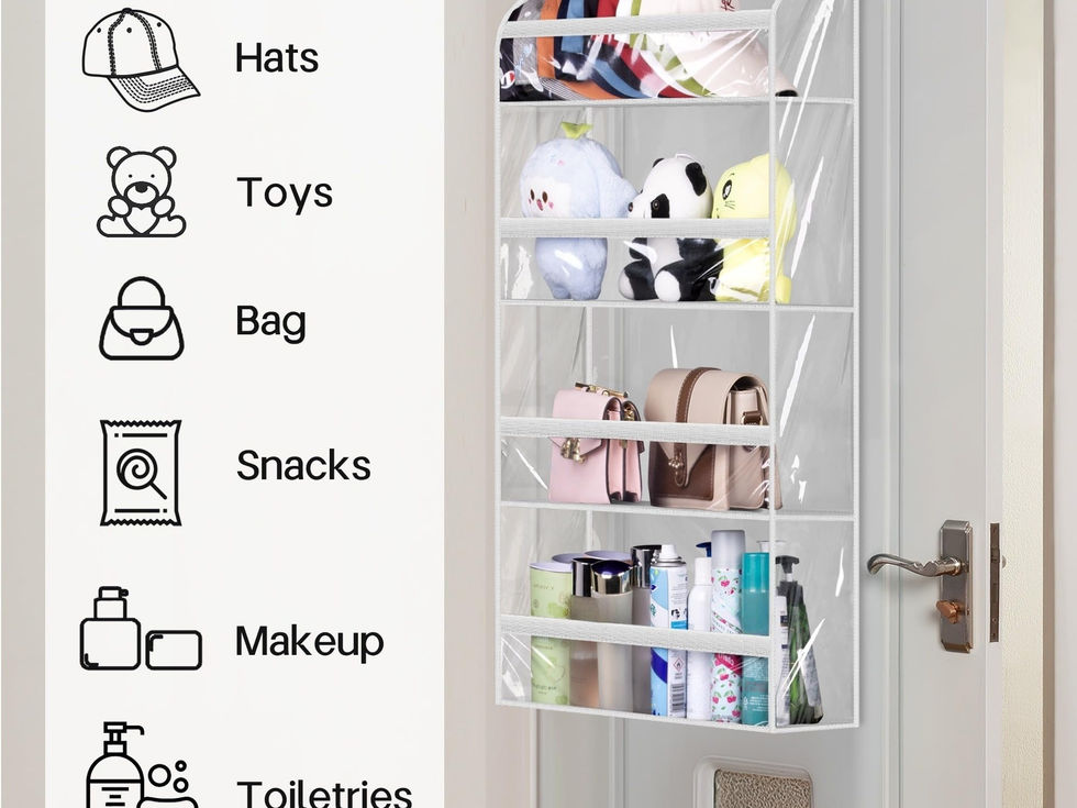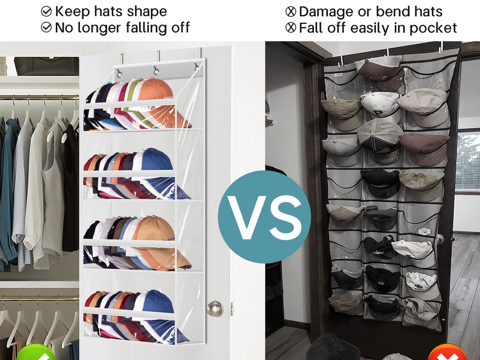 【No Falling or Bend Hats】: Thanks to cardboard at the bottom of each layer and fiberglass strips at the front fence, hat storage for baseball caps can effectively solve your problem, hat shelves can hold hats fixed well while keeping them integrity, and the hats will not be damaged when hanging on the rack for a long time; 【Store up to 48 Hats】: Overall size of hat rack for door: 16.7" W x 7" D x 36.2" H, height per layer is 9.1" H, Each layer is wide&deep enough to hold 10-12 snapback caps, so cap rack can store up to 48pcs hats in total, fit for flat bills hat, jelly hats, fitted cap, trucker cap, golf hat, sun hat, ball cap, visors, mini cap or other caps; 【Easy to Access】: Clear PVC & the special open design is convenient for you take form the deep pouches without rummaging through boxes, besides, fully transparent design make baseball hat organizer a unique hat display stand, especially for hat collecting fanatics, you can fully display your valuable hat collection. If the surface gets dirty, simply clean it with a soft brush or wet cloth; 【Reversible Hooks Fit Standard Doors】: Each pack with 3 metal hooks that fit for doors as thick as 1.42 "-1.77", stable and not easy to slip off, each over door hook can hold 15lb of weight. Hanging hat organizer easy to install and requires no DIY skills or tools, you can hanging back of closet door, bedroom door, pantry door etc; 【Multi-Purpose】: Hat organizer for closet, door or wall is not only a better organization of baseball caps, but also a good storage for toys, purses, snacks, socks, scarves, gloves, yarn, accessories, bottles, cleaning supplies, clothes, towels, make up and any other household items as you wish.