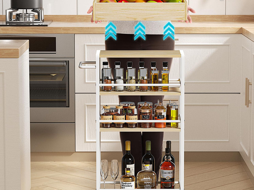 Kitchen Rolling Cart for Small Spaces: The kitchen cart sized at 16.5"D x 8.5"W x 34.7"H, easily fits the narrow gaps between cabinets and refrigerators, washers and dryers, sofa and counter, it gives you plenty of extra vertical storage space Space-Saving: The slim laundry cart a total of 4 tier shelves, wherein top with removable wooden storage box, It's perfect for storing snacks, jars of spices, Fruits, vegetables or anything else that takes Robust Durable: This rolling storage cart is made of metal and quality particleboard, a heavy sturdy frame and wooden panels easy to clean. Ideal for extended use in the kitchen, bathroom, office Easy to Move: The narrow storage cart with four 360° swivel casters and the help of its metal handle, easily move the storage cart to wherever you need it and secure it in the desired position Easy to Install: The slim rolling storage cart with the necessary installation tools and Instruction manual, ensure that you can assemble and disassemble it easily