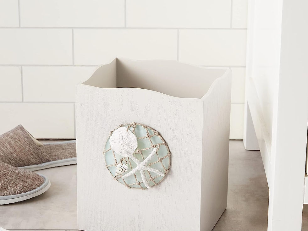 INCLUDES: (1) Wastebasket TIMELESS: Beautiful, durable and the perfect weight, with detailed, hand-painted resin designs. CARE INSTRUCTIONS: Made from food-safe resin, this product should be handwashed only when necessary. This piece is not dishwasher safe. AQUA TRANQUILITY: The Seaglass Collection features a true seaglass color, with netting, seaside icons, and other design details that make this collection special: oversized embroidery, fabric shower curtains with embellishments and durable molded resin accessories. MIX AND MATCH: This piece coordinates with our other Seaglass Collection bath accessories including toothbrush holders, soap dispensers, shower curtains, towels and rugs!