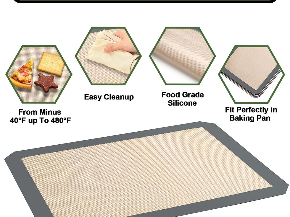PERFECT COMBINATION: Pack of 9 bakeware Set that includes 3 different sizes - 3 rimmed baking pans, 3 cooling racks and 3 silicone baking mats, suitable for most ovens. The multi-size set can be freely combined and matched between different sizes, helping you to easily solve the baking tasks in the kitchen, Perfect for baking bacon, crispy chicken, bread, pastries, cookies, brownies, fruit cobblers making, cooling cookies and cakes and draining water and oil. HEALTHY MATERIAL: Baking sheet pans and cooling racks are made of high-quality stainless steel with good rust and deformation resistance. The non-stick baking mats are made of food grade silicone and reinforced fiberglass, can withstand temperatures ranging from -40°F to up to 500°F, scratch resistant and dishwasher safe. There is no chemical coating on the surface of the baking pan, which makes baked food safer and can effectively protect the health of you and your family. SUPERIOR CRAFT & HEAVY DUTY: Highly mirror polished of the surface of the baking pans are great to reduce the risk of food sticking and easily release food. Each stainless steel rack with tight grid has four raised feet, keeping meat lifted above juice and easily release. Baking mats perfectly fits in the baking pans and safe for oven. EASY TO CLEAN: baking pans adopt excellent surface treatment technology, the surface has good non-stick performance, and the surface is not easy to stick to water, oil, and food, which can effectively reduce the risk of food sticking, allowing you to better enjoy the fun of baking. Cleaning pans and grills are quicker, so you can save more time and spend quality time with your family. PREMIUM BAKING DESIGN: The smooth rolled edge design avoids scratching your hands, making it more convenient and firm to pick up the baking pan. The multi-size baking pan can meet the baking needs in different situations, such as making baked bacon, crispy chicken, pastries, biscuits, and other foods, making the food you make more delicious. The excellent baking performance of the baking tray helps you to enjoy a good baking time.