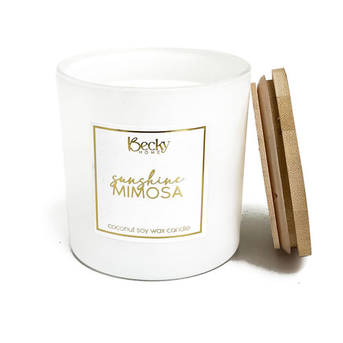 Embrace the uplifting essence of Sunshine Mimosa—a vibrant citrus fragrance bursting with the zesty freshness of orange. Evoking the joyous warmth of a sunlit morning, this delightful aroma fills your home with invigorating notes that brighten any space. Perfect for infusing your days with a touch of citrusy bliss. Elevate the ambiance of your home, office, bedroom, studio, and more with our premium, designer candles. Each candle is hand-poured with highly scented wax and housed in a reusable 14.5 ounce white matte tumbler, topped with an elegant wooden lid. The modern, minimalist design provides a high-end look, while the gentle and unique scent profile adds a touch of sophistication. Each of our scented candles measures 4" in diameter and 4" in height. These modern candles are designed to burn for over 60 hours. Our premium, luxury scented candles are the perfect addition to any home, creating a cozy and inviting atmosphere with their long-lasting fragrance and elegant designs. Crafted with eco-friendly soy wax, our candles ensure a clean, even burn that enhances the décor of any space while delivering an exceptional fragrance experience. The reusable jar is modern, luxurious, and minimalist, adding a sophisticated touch to your home.