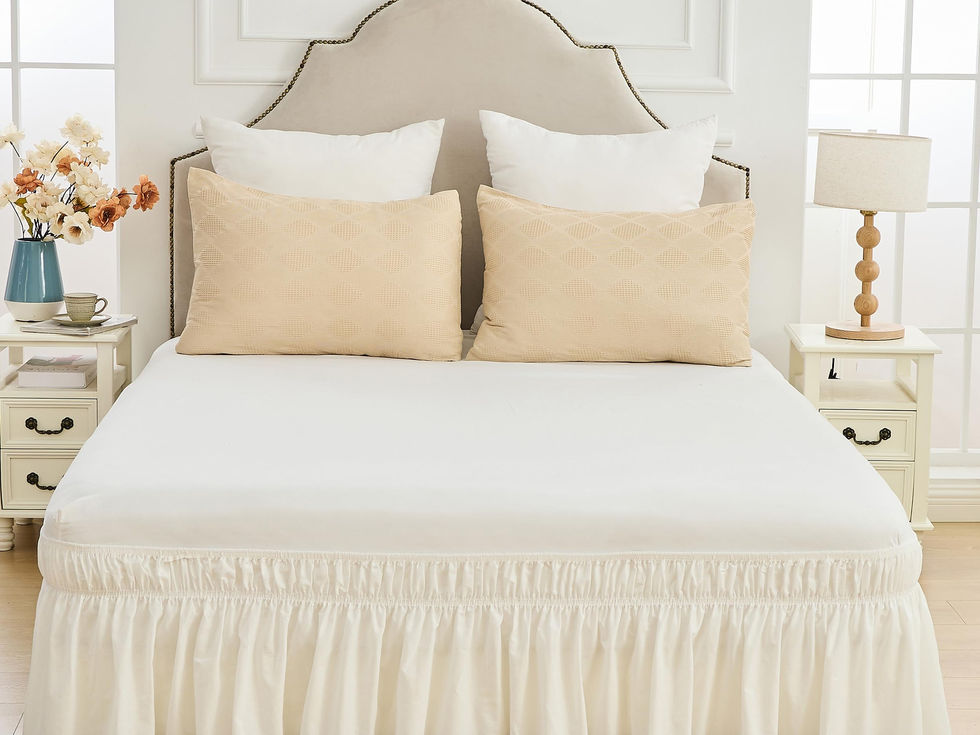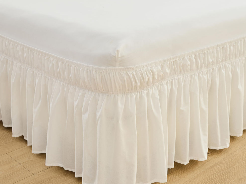 MATERIAL—100% Premium Quality Cotton, soft and breathable. Our product has been certified by OEKO-TEX STANDARD 100, the definitive mark of excellence for products that are good for your health and environment SIZE—Queen Size is 60 x 80 inches. King Size is 78 x 80 inches. The drop length is 17 inches. Only contains 1 bed skirt—Three sides fabric elastic wrap around dust ruffle ADVANTAGE—This new idea bed skirt has no platform, no need to lift the heavy mattress, simply wrap it around your bed and provide a perfect private additional storage space. Perfect combination of durable adjustable elastics and stylish ruffles design WASHING INSTRUCTION—Machine washable, gentle cycle wash under 60℃ with similar colors. Do not dry clean. Do not bleach. Tumble dry at low heat. Iron on medium heat if needed. The cotton fabric will become softer after every wash CUSTOMER SERVICE—We provide 24/7 customer service. If there's any problem with the product, please contact us, we will help you solve it within 24H