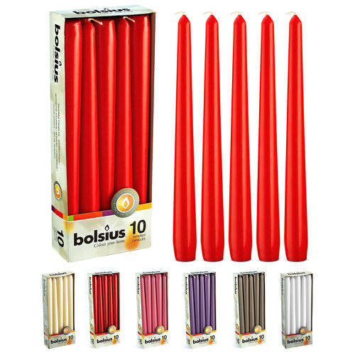 COMPLIMENT ANY SPECIAL OCCASION WITH BOLSIUS RED CANDLE SET: Our 10 inch long unscented candles improve your home décor without spending a fortune. With these tall candles, you can decorate and add warmth to your house in seconds. Our tapeRED candles are perfect for indoor and outdoor use like wedding ceremonies, parties, candlelight dinner, synagogues, and churches. DRIPLESS CANDLES CRAFTED WITH QUALITY AND CARE - Bolsius tall and beautiful unscented candles are crafted from 100% Paraffin Wax for a pleasant flame. The braided wicks are made up of 100% Cotton, which is carefully dipped numerous times in supreme quality wax, to give it the perfect shine and elegant look. PACK OF 10 MULTIPURPOSE RED TABLE CANDLE STICKS - The super value pack carries 10 tall, and elegant design chime candles which can be used in commercial decoration or at home decor. Perfect fit for all the standard candlestick and taper candle holders. Our unscented table candles can be used as the centerpiece to enhance weddings, buffet tables, and all events CLEAN BURNING UNSCENTED LONG CANDLES - Our dripless candle stick burns a clean and smooth flame for up to 8 hours. These unscented stick candles are 10-inch long and have a 3/4-inch base diameter. It will provide you a warm and comfortable ambiance during festival times as lent candles, advent candles 100% SATISFACTION GUARANTEED - Bolsius always gives priority to customer satisfaction. If for any reason you are unsatisfied with the quality of our dripless taper candles, feel free to contact us, and we'll make things right.