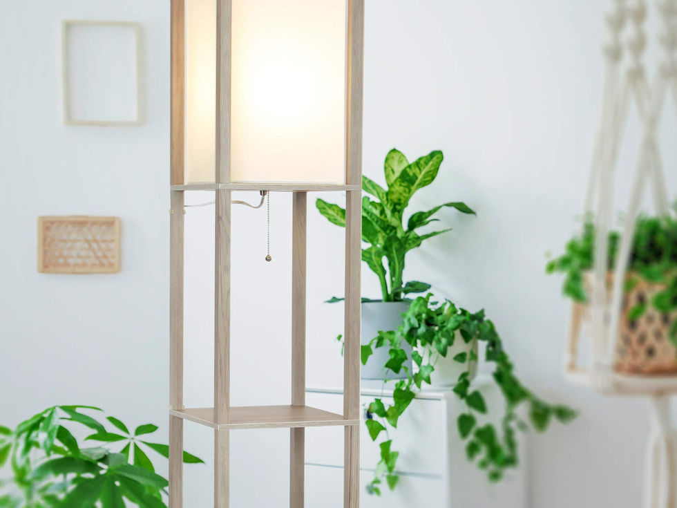 ALEXA Compatible Floor Lamp with 20 Year life LED Bulb: Brightech shelf lamp includes a 9.5 Watt power-saving LED light with 20,000-hour life, or about 20 years' use. That saves you 85% of the cost of halogen or incandescent bulbs. This office lamp also can work with smart outlets that are Alexa, Google Home Assistant (/Mini), or Apple SmartKit enabled, to turn on/off (Smart bulb & outlet required, sold separately). Triple Storage Lamp & Shelf Combo: This durable tall lamp with stable structure, high loading lends a soft ambient glow to contemporary spaces while providing a 3 tiered display shelving for added convenience. Style and function combine to brighten up your room and provide a storage or display area for vases, books, or other items. Utilize the convenience of this floor lamp in your bedroom, living room, guest room, foyer, or office. Quality Lampshade with Soft Light: Brightech modern shelf floor lamp is made of high-quality fabric. This off white shade softens brightness and opens at the top filter light into a diffused glow. Create a cozy and comfortable atmosphere at night with this 3,000K warm white LED standing lamp. Versatile Contemporary Floor Lamp: Contemporary wooden design, simple and elegant appearance, classic Asian style, compatible with most living room decors. Utilize this modern floor lamp with shelves to create a simple and uncluttered living space. You can read, chat, nap and meditate under the corner light stand. THE WARRANTY: Unlike other brands, our floor lamps are built to last, and we stand behind that. That's why Brightech USA offers an industry-leading 3-year warranty covering defects, malfunctions, or sudden failures to your standing lamp when purchased through us. Thanks to our friendly USA-based support team, you'll rest easy knowing your shelf lamp has the backing you can trust.