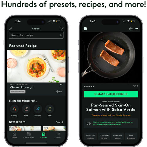 PERFECTLY COOKED FOODS: This smart cooking thermometer takes away the guesswork with real-time internal temperature updates, flip reminders, rest indicators, estimated time left, and more. QUAD SENSORS: Get maximum cooking accuracy from any angle with 3 internal and 1 ambient sensor. UNLIMITED WIRELESS FREEDOM: Long-range connectivity means you can remotely monitor cooking while chatting with friends and family and still get a perfectly cooked meal. COOKING PRESETS: Get help setting optimal cooking times for various foods with choices for meat, cut, and doneness right on the CHEF iQ App, or choose from hundreds of delicious recipes. PROTECT YOUR PROTEIN: Ultra-thin design keeps proteins intact and juices inside for perfectly cooked meat every time.
