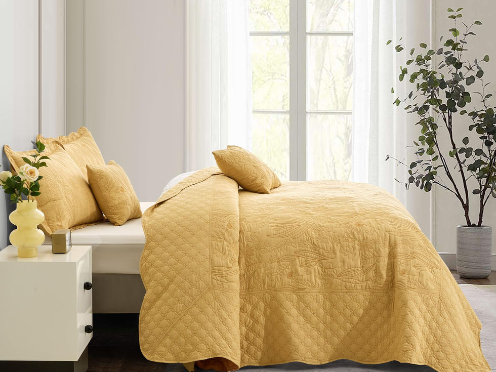 BEAUTIFUL STITCHING - Real stitching make a real value. Quality craftsmanship, using all-over stitching, tight weave, sturdy, clean and neat. No loose threads or ravels. PERFECT SEASON DECORATION - Leaves Stitching Pattern with beautiful scallop edge brings Elegant and fresh look to your bedroom decor, Reversible with the same pattern and color on both sides. It is a good choice to decorate and enhance the master or guest room with this stylish bedspread set. LIGHTWEIGHT & SOFT - Obtained OEKO-TEX Standard 100 certification. 100% Polyester, Excellent Quality Material, the texture is slightly brushed, soft and light which perfect for all season. In summer or warmer weather, you can layer it with a blanket/sheet underneath. In the winter, you can add a comforter underneath. HASSLE-FREE CLEANING: Easy to clean (NO Dog's hairs left), machine wash cold and dry quickly. Resistant fade, shrink, pilling and wrinkle. More durable than cotton (you may follow the care instructions). SIZE AVAILABLE - Full: (96"x110") and Shams*2 (20"x26"+2") with Decorative Pillow(16"x16"). Queen: (102"x118") and Shams*2 (20"x26"+2") with Pillowcase*2 (16"x16"). King: (120"x118") and Shams*2 (20"x36"+2") with Pillowcase*2 (16"x16").