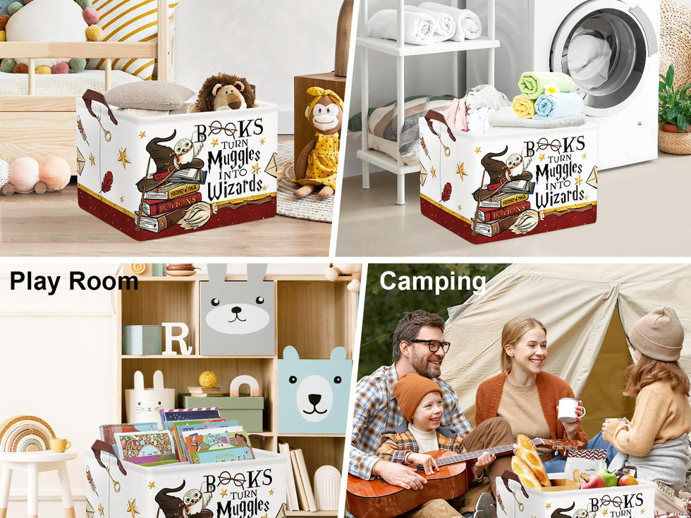 Retro Red Toy Baby Basket: desgin with kid favourite magic hat, wand, book, broom stick, match the vintage red, fun and mysterious, your baby will like it Large Baby Hamper for Nursery: broomstick book basket, store stuffed animals in kid room, books school supplies in classroom, toys in preschool nursery daycare, dirty clothes in the bedroom Collapsible Clothes Laundry Basket: Organize laundry accessories in laundry room, toiletries in bathroom, food snack in the kitchen, towel and blanket on the beach and pool, tools on the car, art supplies and so on Portable and Waterproof Bin: Size: 15.7x11.8x11.8 in, 36 L with PE coating, handle, metal frame, easy to clean, convenient for housework; soft sides make your toddler lug it around to anywhere to unload toys easily and play Applications Occasion: Suitable for bathroom, bedroom, living room, children room, nursery room, study, laundry room and so on
