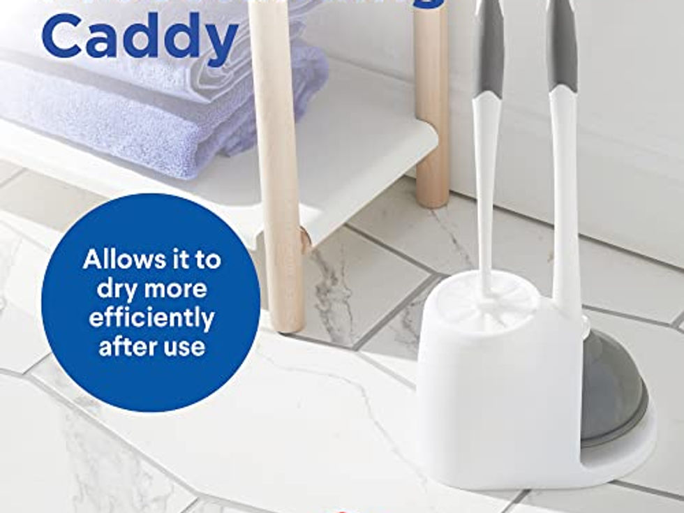 TOILET PLUNGER & BOWL BRUSH SET: This toilet brush and plunger set includes a coordinating hideaway caddy for convenient access and discreet storage in bathrooms when not in use. Perfect for tackling plumbing emergencies and keeping your space organized. HEAVY DUTY FLANGE CUP PLUNGER: Designed with a flange cup, this plunger for toilets creates a seal to exert maximum pressure and clear even the toughest clogs quickly. TOILET CLEANING BRUSH: Durable large round bristles on this toilet scrubber make cleaning hard-to-reach areas around the rim quick and easy. Leave a thorough clean for satisfying results. DISCREET HIDEAWAY CADDY: The storage caddy allows the plunger and brush to dry more efficiently after use and helps keep your floors clean and sanitary. The plunger locks into the caddy so you can carry it from room to room without dripping. ERGONOMIC GRIP: The plunger and brush have a long handle that provides a firm grip and leverage when unclogging and cleaning. The grip handle makes for comfortable use and effortless cleaning.