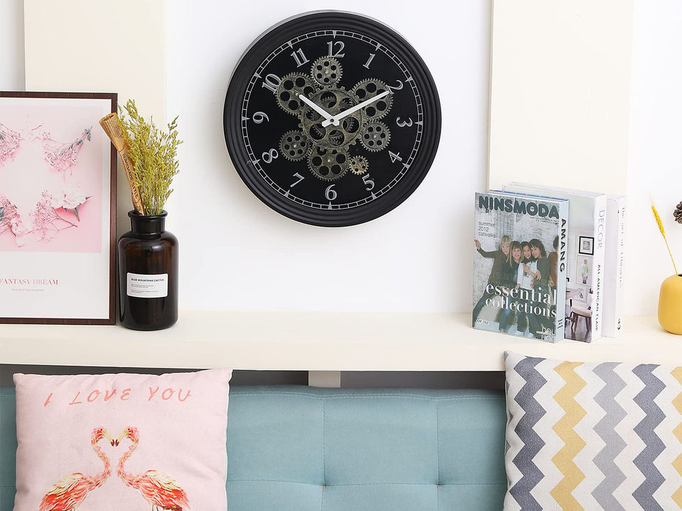 [Unique Exposed Moving Gears] Industrial decor inspired, when you put 3 AA batteries in, various exposed aged gold cog start rotating, definitely an eye-catching wall décor gears clock for your home, surely capture anyone's attention [Accurate Quart Movement ] Based on quality quartz movement, it function as beautiful wall decor pieces besides telling time, and bring both style and purpose to any room. Sit and watch the time fly by with this stunning gear clock [Functional Home Decor Clock] Perfect blend of modern Contemporary & industrial style, fits most decor whether french country, rustic farmhouse, vintage traditional classic, shabby chic, Elegant Mid-century; Suitable for kitchen, dining, living room, fireplace, foyer, hallway, entry hallway ,bar, restaurant, coffee house, office, covered outdoor garden patio and more. Also can be a great house warming gift [Easy to Read and Hang] 15" Diameter *3" Thick/38.5*7cm,this office décor black and gold clock made of high-quality metal, HD glass-Clear glass lens protects the clock face from dust. Requires 1 AA for clock operation; 2 additional AA for moving gears, Gears move independently of hands ,battery not included; Keyhole for hanging is in the back included [Ideal Unique Gift Idea] When moving into a new love home or seeking for a unique gift for your family or friends,this modern gear wall clock will be your good choice.It can be a great house warming gift,Mother's Day Gift,Father's Day Gift or Christmas Decoration Gifts