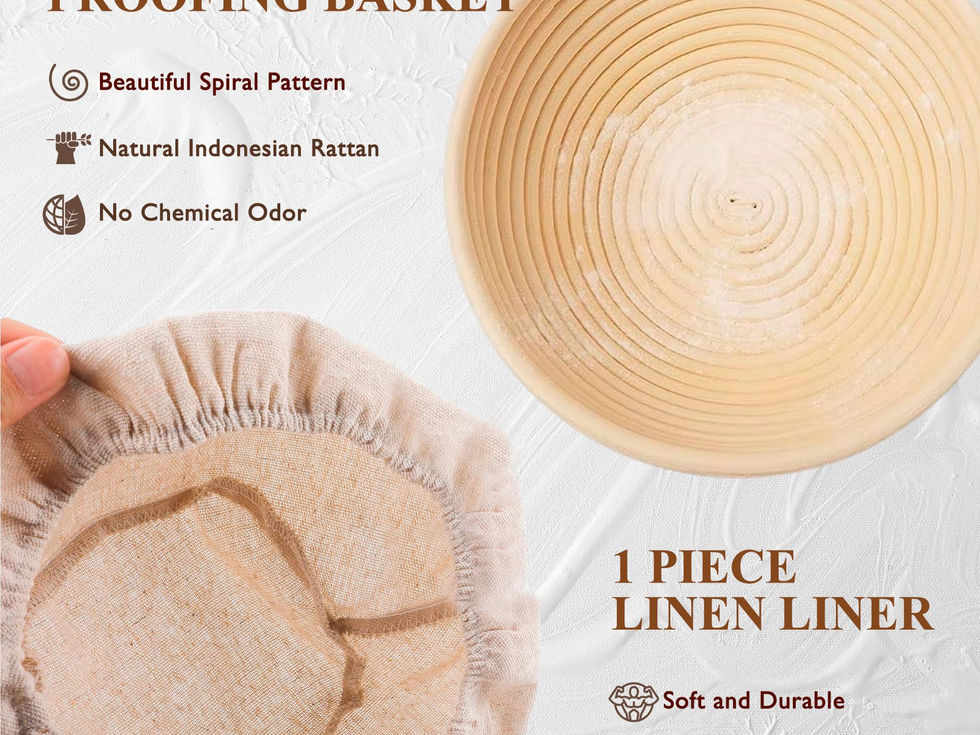 【Sourdough Starter Kit】: Complete baking supplies- include the Sourdough Starter Container, 9" Bread Proofing Bowl & baking tools you will need to make delicious and nutritious homemade sourdough bread. Also, Printed recipe book, user manual, etc., Included. 【24 oz Sourdough Starter Jar】:24 oz capacity is enough to make 2-4 sourdough loaves. You can easily add flour and water to wider-mouth glass jar and remove the starter when needed. 【Perfect Gift】Enjoy baking sourdough bread with family and friends. Our kit has necessary tools and you don't need to worry other things.It's perfect for bread baker & beginner. 【Durable Banneton Bread Proofing Basket】:Our Basket is made of natural Indonesian rattan. Compare to other bannetons' supplies, as the top chain of production line, our baskets are smooth, no splinter and never to mold, safer for your family. Note: Before putting the dough into basket, please sprinkle a thin layer of flour on the basket to ensure less sticking issues. 【Easy Cleanup】After each use, simply pat or brush the surface lightly and any remaining flour will come off. For the jar, the writing scale is clear, please avoid using lemon or orange-flavored dish soap.