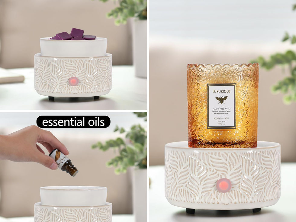 【Fashionable Design】 This higher quality ceramic wax melt warmer adoption floral pattern design is fashionable. suitable for home, office, hotel or bedroom decoration are equipped with furniture. our heaters are also Ideal for christmas, thanksgiving, birthdays, parties, weddings, anniversaries; ldeal gifts for friends, lovers. 【Multifunctional Perfume Warmer】This is a multifunctional 4-in-1 electric candle wax melter dimensions of 4.05* 4.05 * (2.32+0.83) in and 0.95 lbs. you can choose your favorite aromatherapy candle to out in the warmer, or you can melt the wax or drop the essential oil in the tray to release your favorite scent into your home. the wax burner will delight you and your guests by eliminating unpleasant odors such as grease, tobacco, pet odors, garbage and unpleasant bathroom smells. 【Energy saving and environmental protection】Candle melter heater works with burner, wax block and fragrance oil at the same time, which is a safer and cleaner ideal alternative to burning traditional heater. Our incense wax heater has a heating plate as a safe heat source, making the temperature stable and reliable with no open flame, smoke, dust or other pollutants. 【Easy to Operate】Ceramic scented wax melt has a removable wax melting tray to heat the wax directly on it very easy to operate and safe to use, please note that please do not let children or pets directly touch the product being used. 【Satisfaction Guaranteed】-This product has CE certification, ETL certification.If you aren't completely satisfied with our premium wax warmer, simply contact us within 30 days of purchase and we will easily resolve the issue. We offer a risk-free 30-day guarantee with every purchase!
