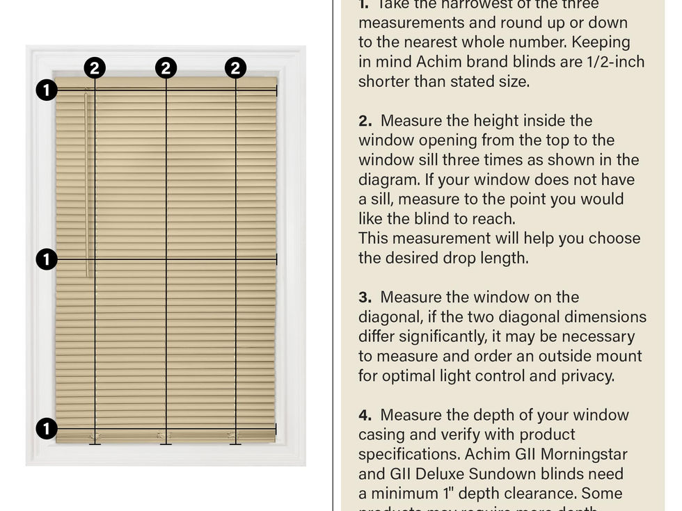 Room Darkening Cordless Vinyl Blinds: Reduce heat and help save on the electric bill while filtering out light with the Achim Home Decor CO GII Deluxe Sundown Cordless Room Darkening Mini Blinds. Engineered for privacy, these PVC blinds with no cords to get tangled are child and pet safe. Blinds will fit windows 3/8" (0.95 cm) smaller and 1/2" (1.27 cm) wider than stated size. Actual blind is 1/2 " (1.27 cm) narrower than stated size. Actual slat size is 1". Easy to Install: Includes all the hardware you will need with simple instructions to make installation easy and convenient! Features hidden mounting brackets designed for inside or outside the window frame installation. How to Use: Whether you want to darken your room or take in the view, simply lift or lower the bottom rail to raise or lower blinds. Use the tilt wand to filter in the ideal amount of light and privacy. Choose from a Wide Variety of Styles: Available in 6 colors: White, Latte, Black, Mahogany, Grey, and Alabaster. These blinds have a durable, high quality construction that resists warping, fading, and sagging. Bringing Great Designs Home: Achim Home Decor has been bringing fashion and value to your home since 1962. Specializing in decorative window and floor styles, we pride ourselves on offering outstanding value with the highest quality standards.