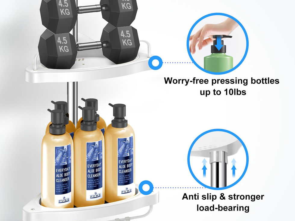 4 LARGE SHELVES ORGANIZER: This shower pole caddy has 4 tier large trays, each shelf can storage 2 large pump bottles or 4 medium bottles. Ideal for contain bath supplies like shampoo, soap, conditioner, body wash with extra towel bar and hooks are able to hanging your towel, razor and more. It has a self-draining system, so it will not accumulate water and will keep your bath products clean and tidy MORE STABLE AND SAFE: Our non-slip silicone ring designed by an upgraded tapered-shape, which can effectively prevent the shelf from slipping off and keep the tray in place stronger. The strong powerful tension spring inside the standing shower make it contacted with the ceiling and floor tightly without shaking or falling down RUST PROOF 304 STAINLESS STEEL SHOWER CADDY: Our shower caddy is constructed by hard plastic shelves and 304 stainless steel rods which can effectively prevent from rusting and durable for years FIT MOST SHOWERS OR BATHROOM: This shower pole could be adjusted 38 inches to 118 inches height. Ideal use for bathroom, bathtub and shower and so on. Besides, let your bathroom or shower room looks pretty and orderliness. It also has a self-draining system, so it will not accumulate water and will keep your bath products clean and tidy EASY INSTALLATION: No-punch installation, just a few minutes, no wrench and tools. The top is designed with buffer springs to better protect the ceiling, and the rod tension mounts from the floor or side of tub all the way to the ceiling