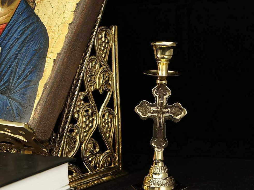 Height: 13cm (5.11 inch) Designed to hold 5/8 inch - 3/5 inch (17-19mm) candles Handmade from solid brass Perfect addition to your home icon altar or prayer corner