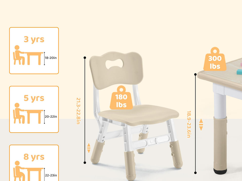 【Height Adjustable Table & Chairs】7 height levels for the kids table from 18.9" to 23.6" plus a foot spinner to cope with uneven ground, 3 height levels for the chair seat from 10.6" to 12.2". The tabletop of our toddler table and chair set measures 23.6"x 23.6", with a maximum weight capacity of 330 pounds for the table and 180 pounds for the chair. 【Safe & Sturdy Design】This kids study table and 2 chairs set is made of plastic, which is durable, non-wobble and not easy to be deformed for long term use. Each chair in the children multi-activity table comes with two crossbars to increase sturdiness, significantly enhancing the chair's weight-bearing capacity. This ensures that the chairs can safely accompany your child through every happy day. 【Specially Designed Table】The children table and chair set top is paintable and erasable with water based paintbrush. This kids table features anti-scratch arc corner, which can protect children's skin from bruise. This kids play table have 7 adjustable heights, very sufficient to suit 2-8 years old kid. Great for playroom, classroom, study room and dining room. 【Ergonomically Designed Chairs】The ergonomically designed sunken chair seat and backrest can protect children's spine and correct their sitting posture, great to keep children from humpback. Cute bowknot hole on backrest for easy grab and carry. The legs of this toddler activity table are also equipped with silicone rotators to address uneven floor issues. 【Easy to Assemble】Our CuFun kids table and 2 chairs set can be easily installed in just a few steps. Children art table coming with an installation manual. Follow the instruction, simple and convenient. Note: When installing, ensure the arrows on the chair's crossbars are facing upwards. An electric screwdriver will aid in better assembly.