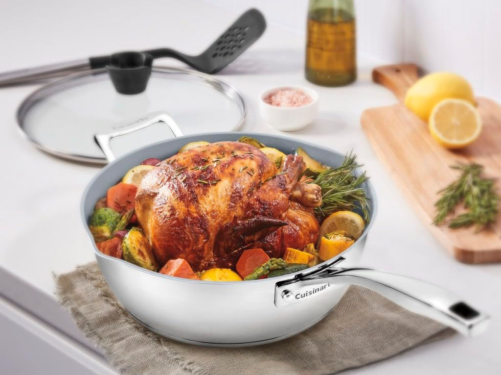 4-Pc Set Includes - 4.5 Qt. multi-purpose pan with cover, steamer, slotted turner The pan that does it all! Performs at least 14 cooking tasks - poach, steam, strain, sauté, sear, fry, boil, simmer, sauce, braise, deglaze, brown, bake, roast Cuisinart’s exclusive PURELYCERAMIC nonstick Advanced release system EasyGrip silicone handles
