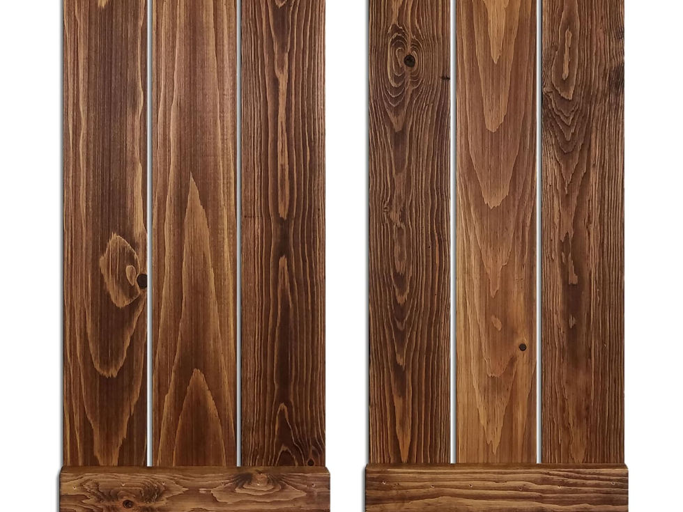 Our Board & Batten Shutters are custom made to order, Handmade in Warrington, PA USA. This is NOT a mass-produced product. Our customized Shutters are available in 20 colors (Shown in Special Walnut). You can also add optional decorative hangles for that little extra rustic touch. Each order comes as a set of 2 Shutters. Available in 4 heights; 40"High x 11"Wide, 34"High x 11"Wide, 28"High x 11"Wide, 22"High x 11"Wide We offer an optional exterior clear coat, to help protect the shutters from the weather if you plan on displaying them outdoors. Each shutter will have two high strength sawtooth hangers installed and anchors for easy hanging.