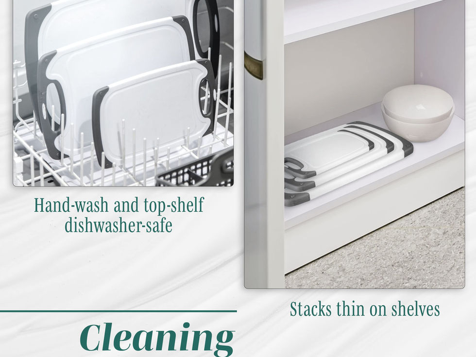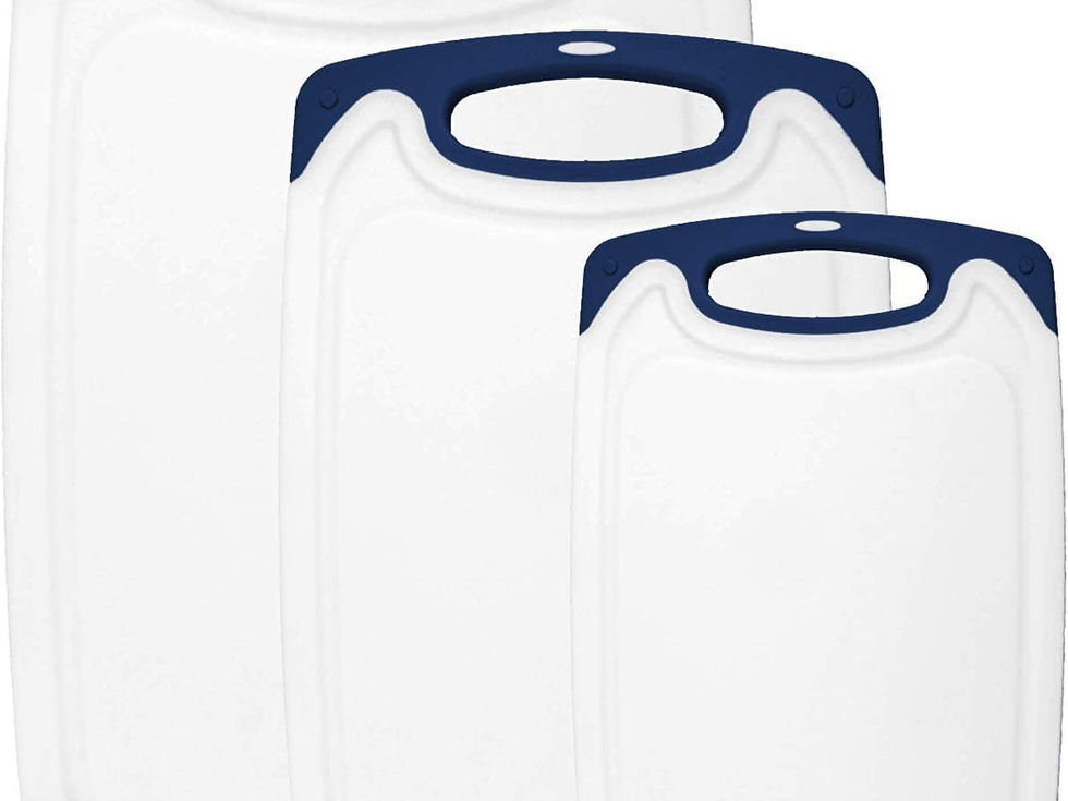 COMPLETE SET - 3 distinct sizes for every kind of cooking! You'll get one large, one medium, and one small cutting board in your set. Perfect for multi-course meals or all-day meal prep. VERSATILE COOKING - Our plastic cutting board set is great for every kind of chopping. Use it for fruit, as a meat cutting board, a fish cleaning station, or put it over the sink for extra counter space. EASY TO CLEAN - The worst part of cooking? The cleanup. Don't make it harder – our plastic cutting boards are dishwasher safe and won't splinter, crack, or peel. Ideal gifts for cooks and bakers! GROOVED DESIGN - Our chopping board set includes juice grooves that prevent sticky or icky liquid from spilling on the counter for a kitchen safe, drip-free experience. THE PERFECT PRESENT - Whether you want to make Christmas cooking a little less crazy for yourself, or you need some gifts for foodies and cooks, our set is perfect for the season.