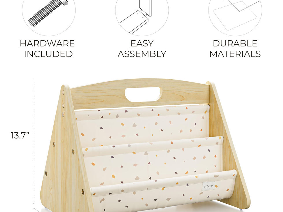 Playful Organization - Make Tidying Fun: ZICOTOs’ portable kids bookshelf is a tidy-up champ! With dimensions of 17.7x13.7x13.5”, it holds up to 15-20 books and also keeps small toys and knick-knacks in order, ensuring your nursery or playroom stays neat and inviting Kid-Friendly Height - Great To Explore & Learn: The kid-height nursery bookshelf sparks curiosity and independence. Tailored for little explorers, it fosters a love for books & reading and teaches organizational skills. It's the key to a tidy and happy kids room! Stylishly Cute Bookshelf For Kids: Simply a charming addition to your home that ignites imagination & joy! With its soft, modern sage hue the portable kids book shelf blends seamlessly into any room, creating a cozy reading nook for your child Top-Notch Kids Bookcase: Crafted from durable wood and eco-friendly polyester fabric, the premium book shelf for kids rooms is built for durability, safety and also for fun & quality time, ensuring peace of mind for you and endless adventures for them! Easy & Quick Setup: Designed for busy parents who want simplicity without compromise, the baby & children’s bookshelf comes with clear instructions, bars & bolts for quick assembly. Spend less time building and more time creating memories - it's that simple!