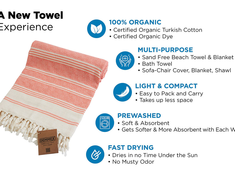 SOFT and ABSORBENT : Made from 100% certified organic Turkish cotton known for its premium quality, softness and excellent absorbency. LUXURIOUS and PLUS: Extra-thick and plush diamond weave provides supreme comfort and luxury with every use. NATURALLY HYGIENIC: Organic cotton is breathable and quick drying, helping keep you fresh without the need for harsh chemicals. SUSTAINABLY GROWN: Certification ensures cotton is grown without harmful pesticides or GMOs in healthy soil and safe working conditions. LASTING QUALITY: Dense construction and attention to detail results in towels that maintain their quality through many washes and years of use. Double tied tassels. Prewashed. Becomes softer and more absorbent with each washing. Unique diamond weave. Made in Turkey.