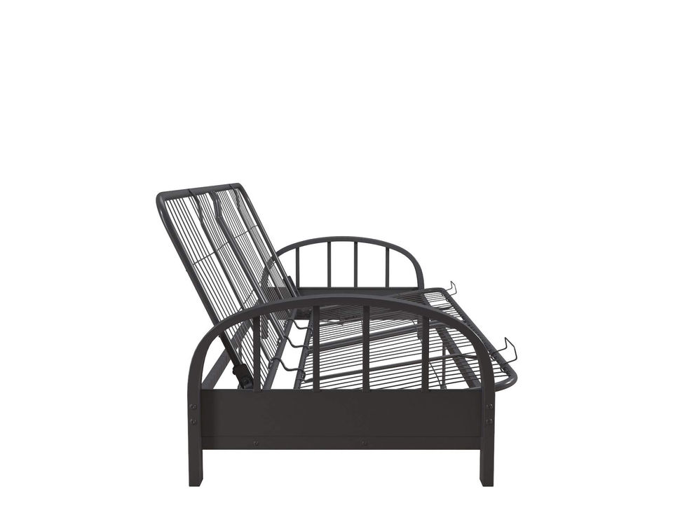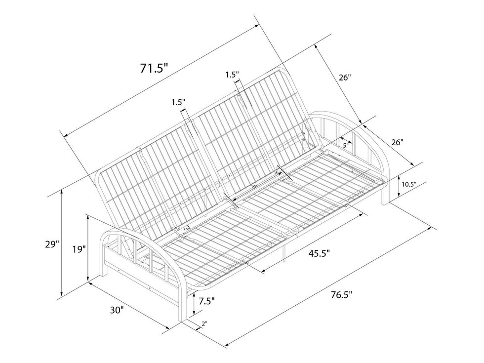 Contemporary low seating design Sturdy construction with metal mesh frame provides additional comfort and support Quickly converts from sofa to a full-size bed with retainer clips to prevent mattress from sliding Ships in one box and assembles quickly. Accommodates a standard size futon mattress, sold separately. Available in black and silver. 1-year limited warranty Sofa Dimensions: 76.5"L x 30"W x 29"H. Sleeping Dimensions: 71.5"L x 52"W x 10.5"H. Weight limit: 600 lbs. Carton Dimensions: 36.5"L x 26"W x 5"H. Net weight: 44 lbs. Gross weight: 48 lbs.