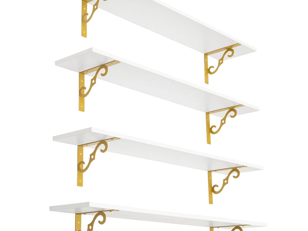 【Well Made】Made of premium particleboard and expertly designed metal brackets, sturdy and durable. Thicker brackets bring added stability and stronger load-bearing capacity(up to 33lbs), supporting the wood shelves without sagging over time. All edges are well-finished for smoothness 【Space Saving Master】Multiple shelves create extra storage space on wall. Wider and longer than others, bringing more possibilities for wall display. Make full use of vertical space to organize clutter and free up messy desktop. Set of 4 long hanging shelves offer multi-layer storage without taking up spaces. Dimension: 39.4"L x 7.9"W x 6.1"H 【Stunning Home Decor】Mid-century design adds a retro-chic vibe to your home. It combines white and gold design, exquisite S-shaped iron, making your home flaunt visual interest and romance. Play your creativity to build an eye-catching area by freely arranging these shelves 【Age with Grace in Any Setting】Turn your any wall into a real eye-catcher space with these large wall shelving. Long and wide enough for plates, glasses, books, legos, games, decorations, collection, photos, or towels etc. Even to be an ideal play area for your cats. Make a statement in entryway, bathroom, balcony, study, kitchen, laundry room, bar area, and office 【Easy to Assemble】Easy-to-read instructions give you a step-by-step guide. Accompanying tools and numbered accessories make installation quick and easy. Two types of expansion screws are provided for different wall materials. Snag-free design of the brackets make screwing in a breeze