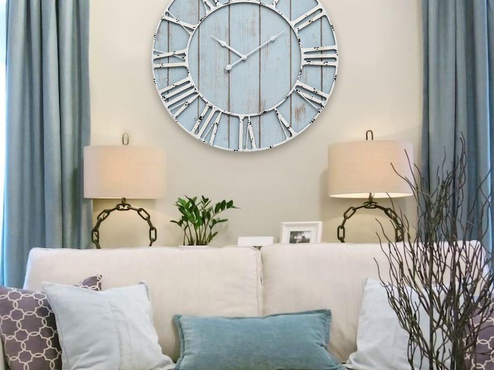 Stunning Design: EMAX HOME Large Farmhouse Wall Clock boasts a vintage look with its beautiful blue wooden texture. The minimalist Roman numerals add an elegant and timeless touch, making it a perfect decor piece for any room. Size and Versatility: This eye-catching wall clock measures 24 inches in diameter, creating a strong visual impact. It perfectly fits in various rooms including bedroom, living room, office, or kitchen, adding a classic farmhouse touch. Quiet Ticking: The precision design of the clock ensures nearly silent ticking. It provides a calm and serene environment, making it ideal for places where silence is golden. Easy to Operate: Our clock is battery operated, allowing you to easily set up and use it. The simple installation process means you can enjoy the aesthetic charm of this clock in no time. Please Note: The package does not include the AA battery required to operate the clock. You'll need to purchase one separately. Despite this, the EMAX HOME Large Farmhouse Wall Clock promises a superior user experience with its outstanding features and robust performance.