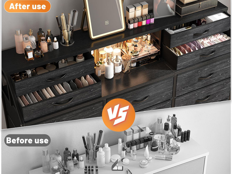 【55.12”W Super Wide Fashion Dresser】The size of this unique dresser for living room is 55.12”W x 11.81”D x 35.43”H, which is super wide dresser on the market with efficient storage solution. It size and style design will meet all your storage needs. The size of small drawer is 17”W x 4.6”D x 3.62”H, the size of large drawer is 17”W x 10.75”D x 7.51”H. Please make sure that the product and drawer size are right. 【Roomy Storage Capcaity】Dresser for bedroom with 13 Drawers and 2 Shelves, different size drawer with 4 small drawers and 9 large drawers design for classified storage. Large storage capacity keeping your clothes and essentials organized and easily accessible.2 tier top open shelves and central compartments can accommodate decorations or any items such as cosmetics, etc 【More Secure Dresser】Dresser made from sturdy metal frame and durable wood board to offer stable support and ensure years of use; The chest of drawers made of premium fabric and durable handle, so the drawers can be opened smoothly. Equipped with anti-tip kits to prevent the dresser for living room from dumping, which is friendly for you. 6 adjustable foot can prevent shaking in uneven places and protect the floor from scratches. 【Multifunction Storage Dresser Organizer】The dressers & chests of drawers provides you with ample storage space. You can use it as a storage table or as a dresser. You can place it anywhere you want to store miscellaneous items, such as behind the sofa, closet, hallway, living room, bedroom, etc 【Easy to Assemble】All tools and accessories are included in the package, and you can quickly install the bedroom dresser with the instruction. This dresser with drawers for bedroom would be a great choice for your family and friends of a housewarming. If you have any question our product, please don't hesitate to tell our after-sale service.