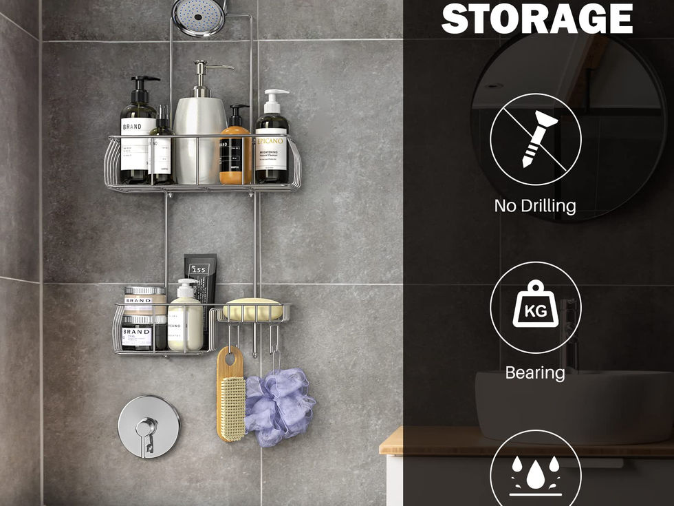 Well-Organized Shower Caddy: This sleek 2-tiered shower organizer, with 13*5.3-inch basket, is a revolutionary bathroom addition. It optimizes your shower stalls or bathtub by neatly while arranging large bath essentials within reach Anti-Swing and Anti-Slip: A rubberized shower head grippe supports the caddy from above, and adhesive sticker hooks secure it from below. It won't lose balance when you take bottles in and out, ensuring a better bath experience Rustproof & Fast Draining: The rustproof metal, with electroplating and powder coating, prevents rust and withstands frequent use. The hollow and open bottom ensures proper airflow for efficient drying and reduces the rust risk Fits Most Shower Heads: Uniquely designed to fit most standard sized shower heads for a seamless look in the shower.Hang the shower organizer easily over the shower arm-NO installation, hardware, or surface drilling damage to worry about Fit Bulk Items Upright: The shower caddy is 26 inches long. It provides enough space for upright storage of bulky items and there's no worry about bottles hitting the showerhead. Before buying, measure the distance from the showerhead to the faucet below