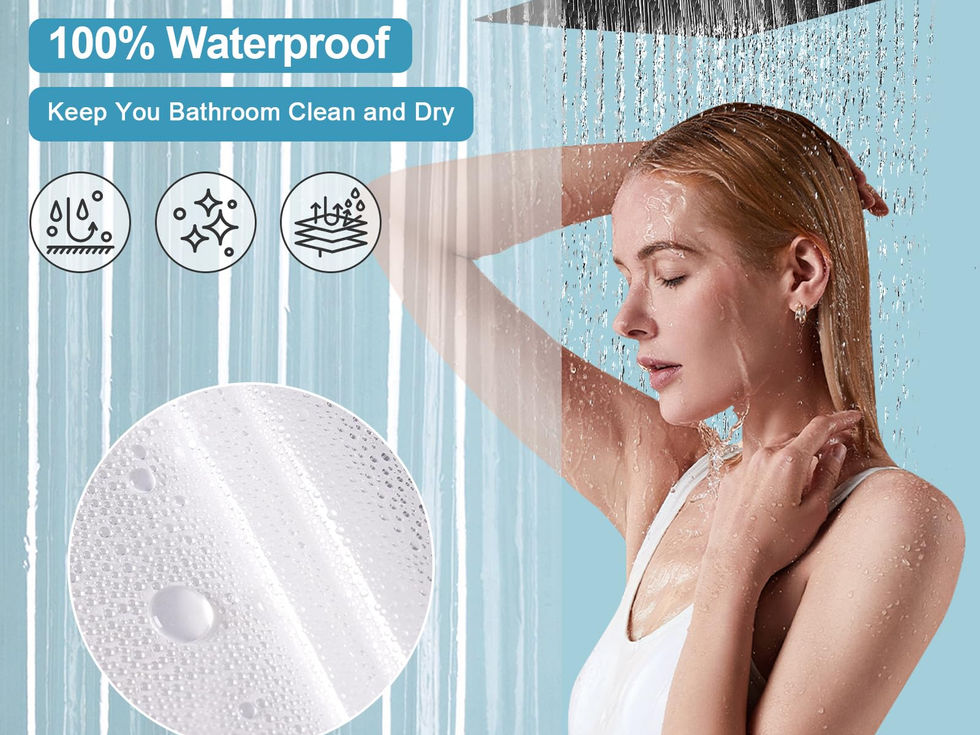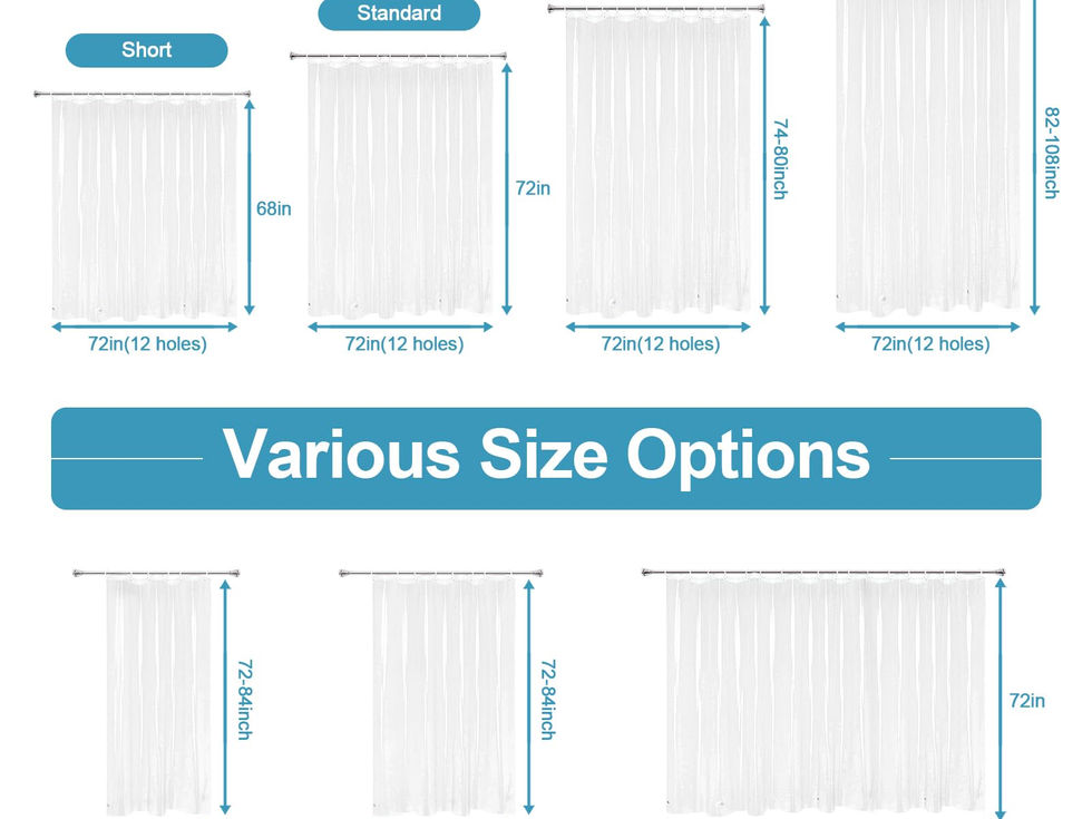 Tall Shower Stall Curtain Liner Size: 36 inch wide by 84 inch length/height,6 holes/metal grommets and 6 plastic hooks for small bathroom bathtub or stall shower room.Please pay attention to the size before purchase. BPA-free and Soft: Made of high-Grade PEVA material, different from PVC, it keeps your bathroom away from harmful chemicals and odors. The heavy-duty plastic shower liner features a proper thickness of 9G, soft touch, and increased durability. 5 Magnet Weights: Equipped with 5 magnets at the bottom to enhance the curtain liner stability, reduces fluttering during bathing, and sticks firmly to the bathtub, keeping away from your body for a peaceful and comfortable bathing experience. Anti-tearing and Anti-rust: Rust-proof metal grommets and reinforced top header improve tear resistance, making the shower curtain liner more durable and extending its lifespan, freeing you from frequent replacements. Waterproof and Moisture-resistant: It can prevent water from splashing or spilling onto dry floors, keep your bathroom fresh. Easy to clean and maintain on a daily basis. Rinsing with water or wiping off foam or water stains with a damp rag after use will restore the original appearance, simplifying your cleaning process.