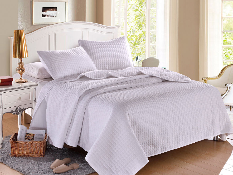 Elegant White solid color Microfiber Polyester fabric on top and bottom sides- 90 GSM. Reversible-can used on both sides. Overfilled with 6D hollow polyester fiber filling 120GSM. Carefully stitched on all 4 edges. Highly durable material. 1” Box Quilting pattern. Looks ultra modern. Luxury Oversized Coverlet Set: Includes Bedspread Quilt FULL (86"X86") and 2 pillow shams (20”x26”) in matching color and design. Premium Quality Polyester Brushed Microfiber fabric Versatile: Perfect for Homes, Hotels/Motels, Other Rentals, Guest room, Dorm room, RV, Vacation home & Rental properties to enhance the beautiful bedroom comfort and decor. Can be used as a quilt, throw or blanket for any bed or sofa. Anti-pilling & anti-shrinking fabric. No lint or shedding. Quilt keeps shape forever. Perfect for all seasons as the lightweight fabric provides warmth without overheating. Breathable Easy care: Fade, Stain, Shrink and Wrinkle resistant. Machine washable (115* F max temp) Do not mix with other colors. Do not bleach. Do not iron.Tumble dry low. Great gift idea any time of year!