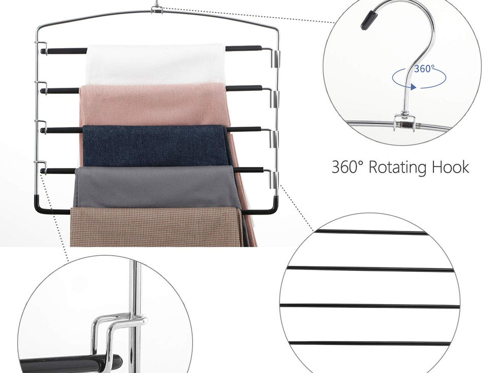 Pants Hangers Space Saving: 5 tier trousers hangers, each space saving hanger organizer at least holds / held up much jeans, scarfs or other clothes, strong bearing strength.Save more space for your closet, keep your closet clean and orderly. It is an ideal pants hangers for women and men Multi pants hanger: Each hanger's space-saving design has 4 arms that can swing out up to 300°, which is convenient for getting pants on and off without mess up the rest.Unique metal hook design can 360° rotate. It’s easy to find right clothes, save your time to match clothes. Perfect for adults, teens, and children, our clothes hangers offers ideal bedroom organization and storage for your closet Closet Organizers and Storage Essential: Smooth surfaces with transparency rubber coating at the end of the hanger to avoid the clothes fall down from closet hangers. Unique swing arms design, you can easily put or take the pants you want. These closet organizers are compatible with all types of clothing. They are perfect for hanging jeans, bra, skirts, pants, shorts, ties, work trousers, slacks, leggings, and more Sturdy Matel Frame: Made of high grade anti-rust stainless steel, don't worry about the distortion of the hanger, always durable and keep a good shape as its premium quality. Our 3 pack of space saving pants hangers can hang 15 clothes pants at least vertically. Experience the ultimate in closet organization with double the power, giving you the freedom to transform your closet into a clutter-free haven you can truly take pride in After-Sales Service: We committed to provide the most reliable with the best after-sales service for every our customers. If you not satisfied with our product or you have some suggestions for product or service improvement, please feel free to contact us and we will provide the most reasonable solution