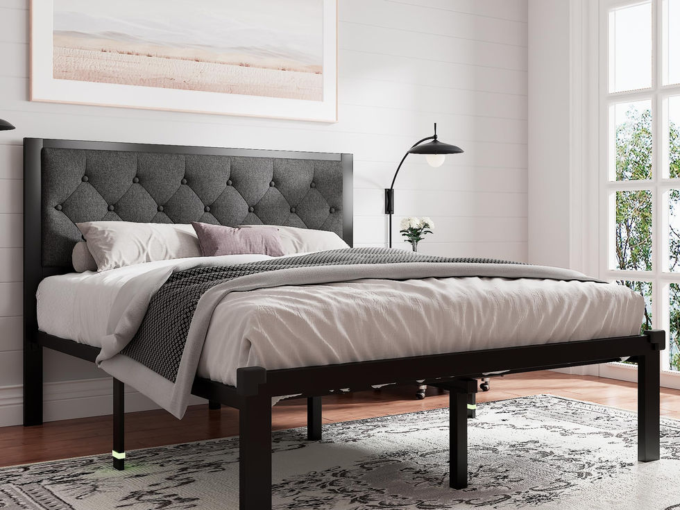 Important Safety Features: Fluorescent strips help you locate bed legs, and avoid stubbing your toes when getting into bed. Wrap-in corner protectors protect children from accidentally hit and severely injured when playing on the bed. Solid as Rock: Consist of hardened square steel slats and 9 support thick legs that can bear up to 1000 lbs. The embedded design keeps the mattress from sagging or slipping. Let you feel free to jump on the bed and no creaks or wobbling. Ultra-Large Storage: The Ample 12-inch under-bed space can hold a lot of items than you can imagine. Even a small room can become well-organized, keep your room clean and tidy. Completely Noise-Free: Built-in anti-noise protection shells on the sides of the metal slats, no gaps at the connection after correct installation. Provide you with a silent environment when sleeping and you can’t hear a single noise. Easy to Assemble: Everything you need will be well packed in 1 box. Slats one-click buckles install, only takes 30 minutes to finish assembling. (NOTE: MATTRESS NOT INCLUDED)