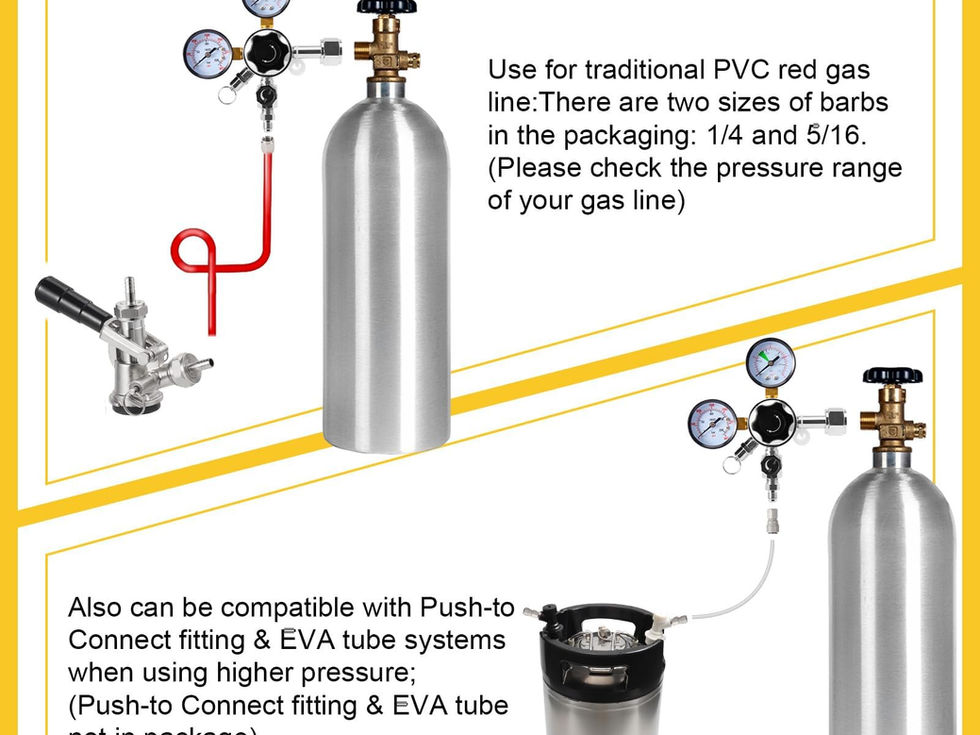 No More Leaks & Smooth Pour: FERRODAY's CO2 keg pressure regulator boasts a robust forged brass body, secure connections, and an expertly crafted tamper-proof pressure release valve, with no gas leakage. Dual-stage pressure regulator always regulates the CO2 twice for better pressure control, so enjoy perfect and smooth pours every time Effortless & Precise Adjustment: Our CO2 regulator features 2 convenient control knobs. The large knob is for precise pressure adjustments, and the small knob is for easy shut-off. There is a built-in check valve inside the outlet to ensure no liquid will back up. All functioned flawlessly, easy to use, no tools needed Lock PSI Settings & Clear Readings: Keep the pressure setting with the lock ring under the big knob. Two generously sized gauges provide exact readings of CO2 volume in the cylinder and output pressure to the keg. Enjoy a clear view of pressure for an unbeatable home brewing experience Safety First: Keep safe with our customized pressure release valve, which will automatically release CO2 at 120(+/-5) psi and can be manually pulled out for a pressure setting reset. We also have a metal filter in the keg regulator's inlet stem that prevents dirt from entering the regulator After-Sales Support: Great quality products as well as excellent service! If you encounter any issues with our regulator, please let us know and we'll do everything we can to satisfy you. Provide technical support. Please Note: When applying high pressure, check if your gas line system is suitable for the pressure first. When pressure is over 70psi, we recommend EVA tubing with push-in fittings(not included in the package)