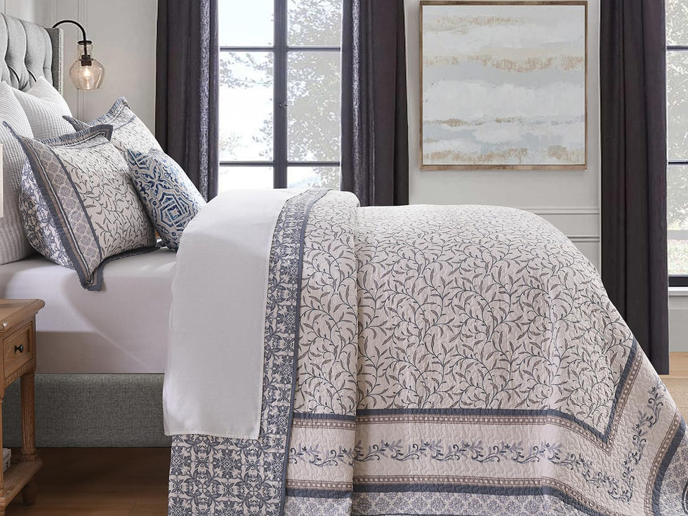 【Oversized Bedspreads】 This 120" x 120" oversized king bedspread has a generous size that ensures it almost reaches the floor, providing a perfect fit for deep mattresses or beds that need extra coverage. This super king bedspread offers a seamless, elegant look. 【100% Cotton】 Made of 100% natural cotton, this king bedspread is healthier than synthetic fabrics. Cotton is soft, breathable, and hypoallergenic, making it an excellent choice for those with sensitive skin or individuals prone to hot flashes or sweating at night. 【Unique Design】 This bedspread features a subtle, sophisticated botanical pattern. The gentle light brown and blue leafy motifs are arranged in a repeating pattern that maintains an air of elegance. This reversible quilt is perfect for those looking to create a calming and peaceful environment in their bedroom, ideal for modern farmhouse or contemporary minimalist decor. 【Versatile and All Season】 This oversized quilt is incredibly versatile. Use it as a bedspread, coverlet, lightweight comforter, or bed blanket. Whether you use it as your primary bedding or layer it with additional blankets for extra warmth, it is suitable for all seasons and is adaptable for year-round use. Its lightweight design makes it perfect for summer, and the cotton filling adds warmth in winter. 【What You Can Get】 This Standard 100 by OEKO-TEX certified king bedding set comes with 1 bedspread (120" x 120") and 2 pillow shams (20" x 36" ). The carefully crafted stitching ensures that this bedspread is durable.