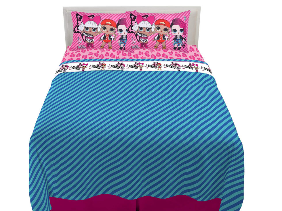 LOL SURPRISE DESIGN: Give her bedroom a rock-and-roll makeover with this colorful sheet set featuring the adorable LOL Surprise dolls Diva, Rocker and MC Swang from the popular doll collection. She’ll feel like a rock star every time you tuck her in to this brightly colored bedding set. SUPER SOFT CHILDREN’S BED SHEETS: Crafted for comfort, the microfiber material is super soft and long lasting, keeping kids warm and cozy all night or while camping. This high-quality sheet set is an enduring choice that's sure to become a favorite in any collection. EASY CARE: You can throw the bed sheets into the washer and dryer without worrying about the colorful themed pattern and animated cartoon characters fading or the need for ironing. The material is wrinkle-resistant making it a great choice for any child's bedroom or nursery as a home decoration accessory. 3 PIECE TWIN SIZE LINEN SET INCLUDES: 1 fitted sheet 39" (W) x 75" (L) featuring deep pockets and fits 10-12" thick mattress. 1 flat sheet 66" (W) x 96" (L). 1 standard pillow case 20" x 30". Designed to fit a standard twin size bed. 4 PIECE FULL SIZE LINEN SET INCLUDES: 1 fitted sheet 54" (W) x 75" (L) featuring deep pockets and fits 10-12" thick mattress. 1 flat sheet 81" (W) x 96" (L). 2 standard pillow cases 20" x 30". Designed to fit a standard full size bed.