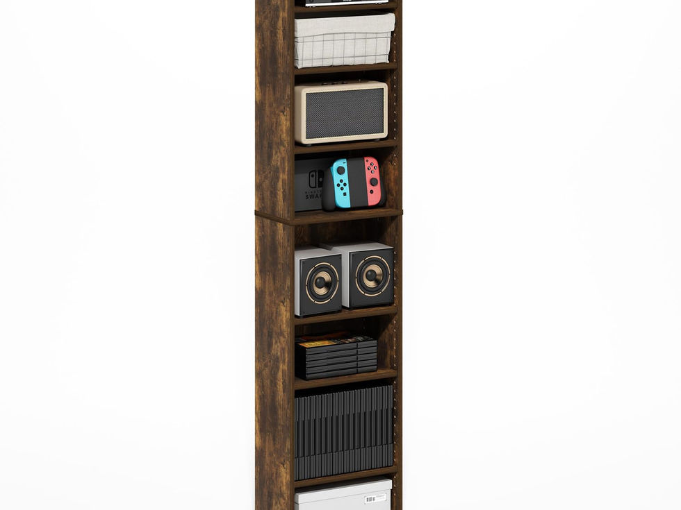 The tall and slim profile maximizes vertical storage while occupying minimal floor space, making it ideal for small rooms, apartments, or home offices. Eight adjustable shelves allow for customized storage configurations, accommodating CDs, DVDs, Blu-rays, books, and decorative items of various sizes. Includes an anti-tip kit for secure wall mounting, preventing accidental tipping and enhancing stability. Manufactured from high-quality durable composite wood, CARB-compliant composite wood carrying the Programme for the Endorsement of Forest Certification (PEFC). Product Dimensions: 6.77 (D) x 11.81 (W) x 51.89 (H) inches