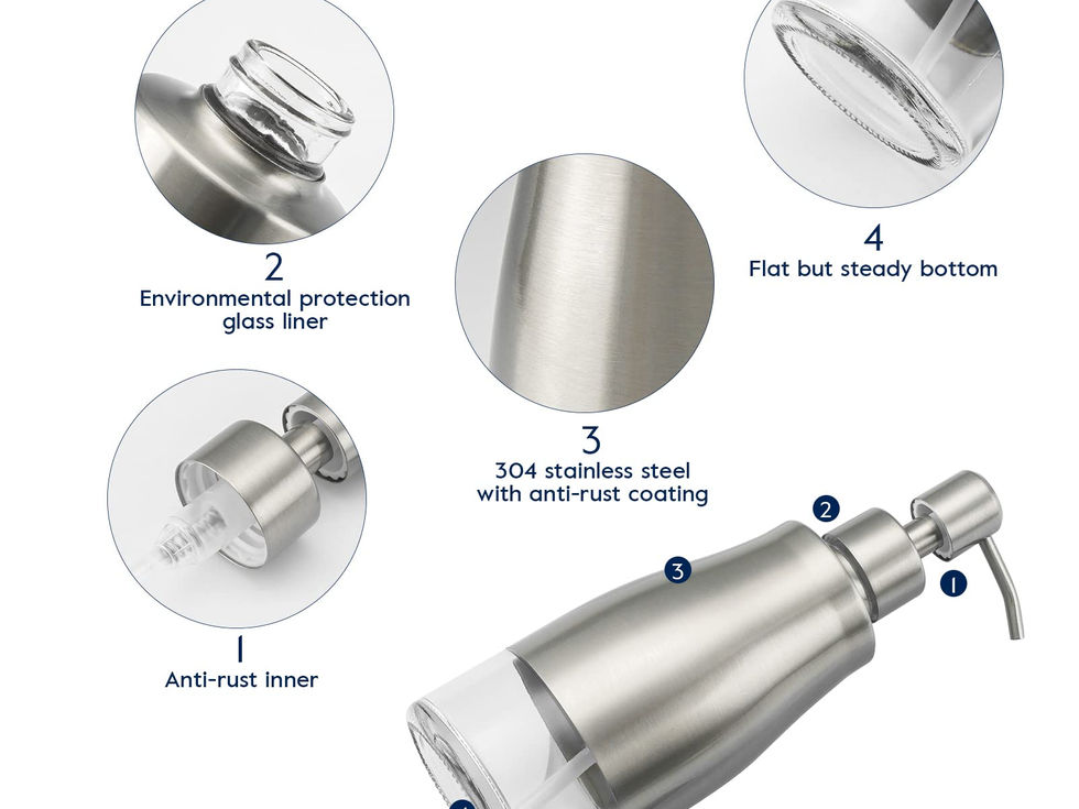 ✅ RUST&LEAK PROOF - Excellent commercial grade 304 stainless steel shell with transparent protective coating to prevent fingerprints and stains. The inner tank adopts a thicker glass container, which is easy to clean and prevents internal corrosion and damage ✅ ELEGANT HOME DECORATION - Translucent and elegant beauty, Perfect to add to your house and farmhouse, Beautify the bathroom or kitchen. It looks practical and creative. Reusable and recyclable clear glass allows you to know exactly when to fill the liquid ✅ BEST PARTNER - 2 x Refillable hand sanitizer dispenser, 2 x Non-Slip Coaster, 6 x Waterproof label stickers. The anti-skid pad can increase the friction at the bottom of the dispenser bottle. MAX Capacity: 11oz / 320ml ✅ VERSATILE SOAP DISPENSER,Perfect Gift - Ideal for liquid hand soap, Dish soap, lotions, Sanitizers, Aromatherapy essential oil blends, Shampoo, Body wash, Mouthwash, Food ingredients and Much more ✅ QUALITY CONTROL/CUSTOMER SERVICE - Soap dispenser has passed the 48-hour salt spray test. The soap pump has passed 30,000 running tests. The dispenser container is made of lead-free glass to ensure health and safety. We are very confident, please rest assured to buy. If you encounter any problems, please feel free to contact us