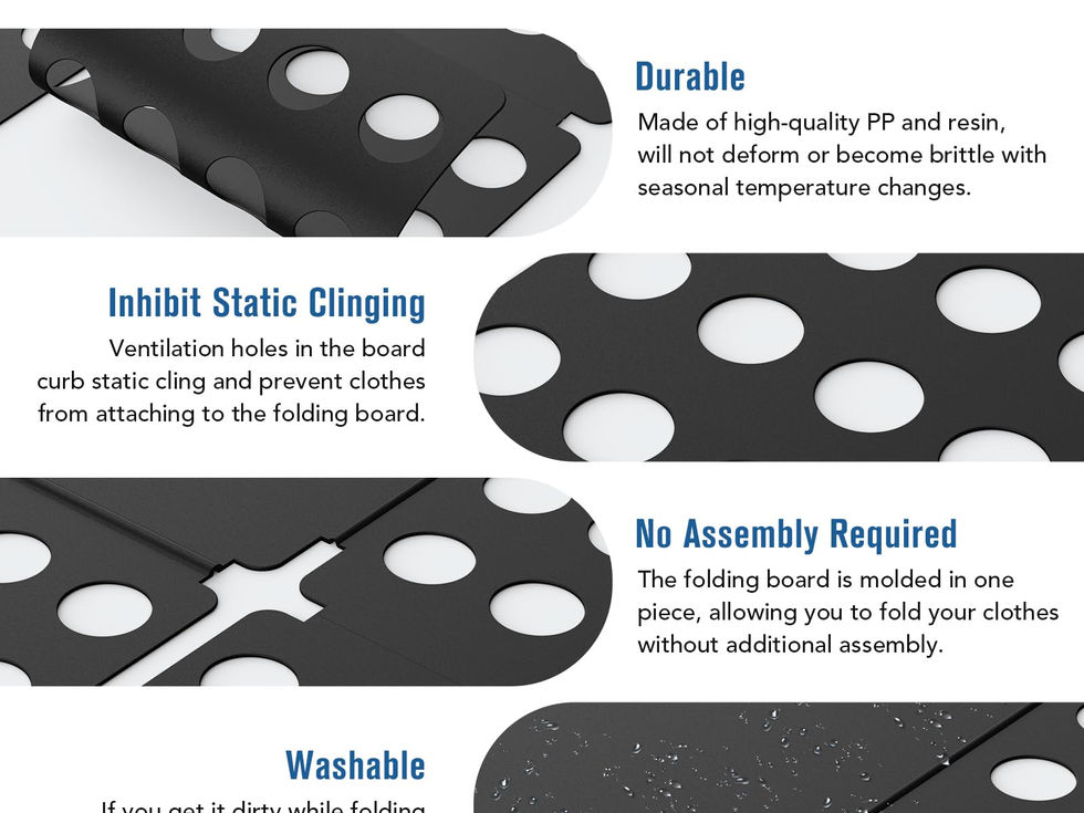 Space-saving: Full size 21.3*25.08 inches, folds to 10.79*8.7 inches for easy storage, particularly beneficial in small living spaces Easy to Use: No assembly is required, anyone can achieve consistent, neat folds with the help of a shirt folder High Quality: The tshirt folder board is made of upgraded PP material, durable and sturdy Versatility: The shirt folding board is suitable for T-shirts, shirts, sweaters, pants, jeans, and dresses Suitable for almost size clothes: For larger sizes, please fold the portion that extends beyond the clothes folder toward the center