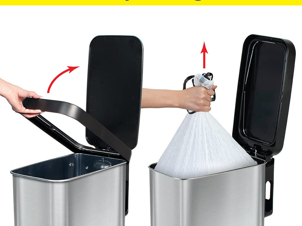 NARROW TRASH CAN SAVES SPACE - The Glad Slim Trash Can easily fits into tight spaces and small kitchens with its slender profile. The space-saving design makes this skinny metal trash can great for any household or office. 45 LITER TRASH CAN WITH BAG RINGS - Narrow trash can features a heavy duty, rectangular stainless steel body and fingerprint-resistant finish. Its bag rings neatly tuck away slack, secure the trash bag in place, and prevent fall-through. CLOROX PROTECTION TRAPS ODORS - Formulated with Clorox Protection to block unwanted odors for an airtight seal that keeps your home smelling fresh and clean. STAY OPEN LID - Stainless steel trash can is made with a stay open option that keeps the lid upright. Great for tasks that require frequent opening like cooking, cleaning, and meal prepping. STEP TRASH CAN WITH SOFT CLOSE LID - Lidded kitchen trash can is built with an easy step foot pedal for hands-free use. Garbage can lid is specially designed for a quiet, controlled open and close every time.